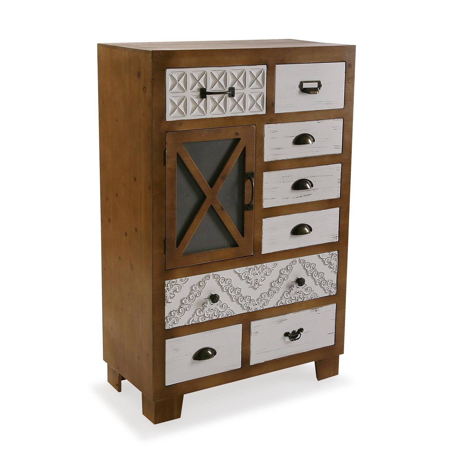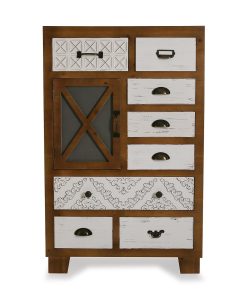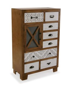 Mobile in legno in stile vintage, composto da 8 cassetti e 1 anta decorati in rilievo. Design semplice e adatto ad ogni ambiente.