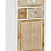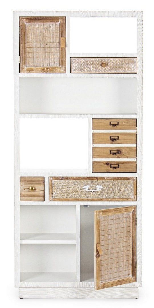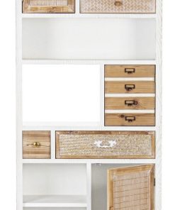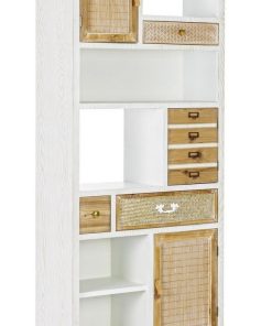 Mobile libreria realizzata in legno colore bianco, suddivisa da ante e cassetti, distinta dalla presenza di inserti in rattan e bambù che rendono l’aspetto più accattivante. Ricca di dettagli, questo scaffale piace per il contrasto equilibrato e gradevole di due finiture del legno: bianco e naturale.