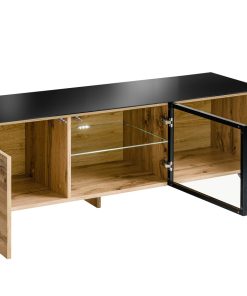 Mobile porta tv con 3 ante di cui una in vetro con ripiano in vetro interno illuminato con luce a led. Prodotto in legno finitura naturale e contrastato da parti in colore nero.