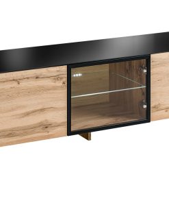 Mobile porta tv con 3 ante di cui una in vetro con ripiano in vetro interno illuminato con luce a led. Prodotto in legno finitura naturale e contrastato da parti in colore nero.