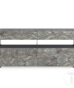 Mobile living dal design moderno e lineare, descritto dall’unione di due materiali come legno e vetro trasparente. La caratteristica dominante di questa madia per soggiorno emerge nell’eleganza dei frontali realizzati con finitura effetto marmo grigio ben abbinati alla struttura colore antracite. La nostra madia mette a disposizione capienza per la tua zona giorno, grazie alle 4 ante, ai 2 cassetti e ai vani centrali.
