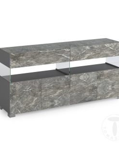 Mobile living dal design moderno e lineare, descritto dall’unione di due materiali come legno e vetro trasparente. La caratteristica dominante di questa madia per soggiorno emerge nell’eleganza dei frontali realizzati con finitura effetto marmo grigio ben abbinati alla struttura colore antracite. La nostra madia mette a disposizione capienza per la tua zona giorno, grazie alle 4 ante, ai 2 cassetti e ai vani centrali.