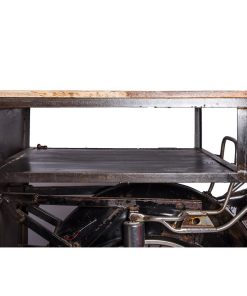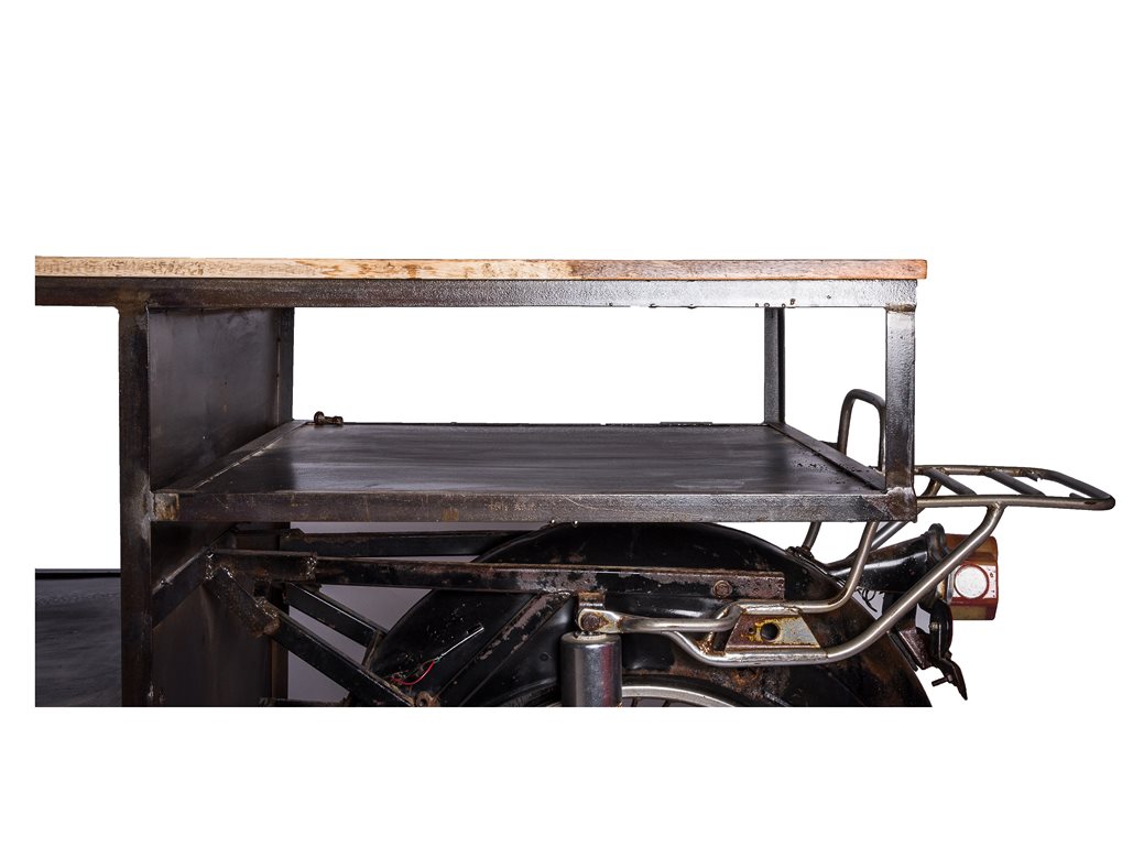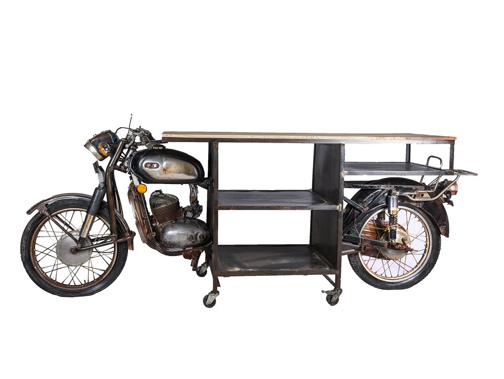 Consolle industrial realizzata dalla riproduzione di una moto d’epoca e con l’applicazione di elementi utili per lavorare oppure semplicemente come oggetto d’arredo eccentrico e straordinario.