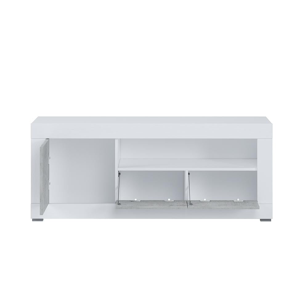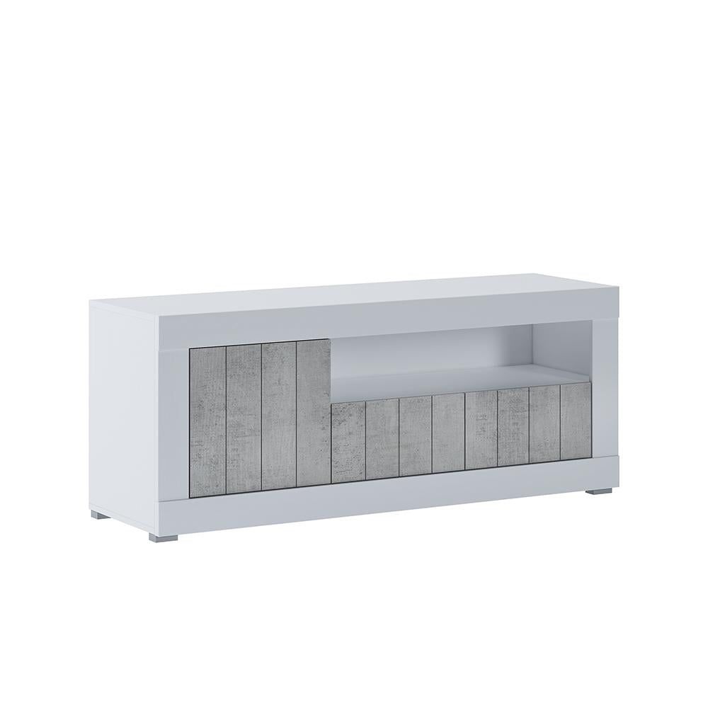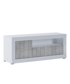 Mobile porta tv realizzato attraverso l’utilizzo di pannelli ecologici di particelle di legno rivestiti in melamminico e composto con una struttura dalla finitura color larice bianco a poro aperto. Questo mobile da soggiorno presenta diverse ante che danno accesso a vari spazi contenitori molto utili per riporre diversi tipi di oggettistica, ed un vano a giorno allestitile con apparecchi di riproduzione multimediale. A contrapporsi al bianco che domina la struttura è la finitura color cemento che viene applicata sulle ante del mobile, in modo da creare un effetto chiaro-scuro che non solo esalta lo stile, ma conferisce al mobile una meravigliosa bellezza da sfoggiare in ogni momento nel tuo soggiorno.