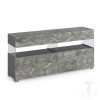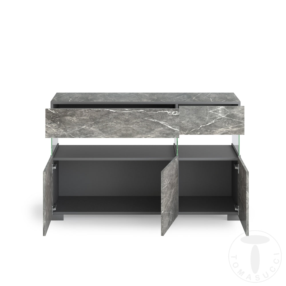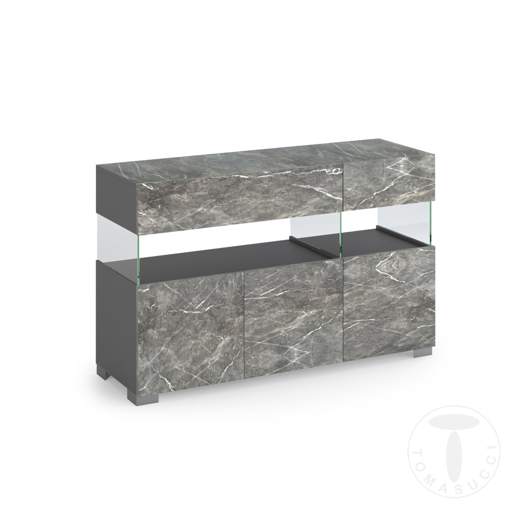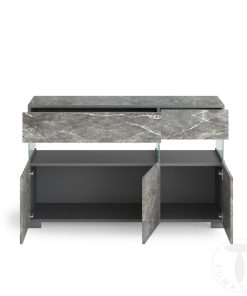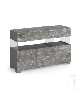 Mobile zona giorno realizzato in legno con frontali in particolare finitura marmo colore grigio. Il nostro mobile design esprime uno stile moderno e singolare, grazie alla struttura essenziale che nasconde 3 ante e 2 cassetti, arricchita da parti in vetro trasparente che creano dei pratici vani centrali e che aumentano la ricercatezza estetica di questo mobile living.