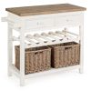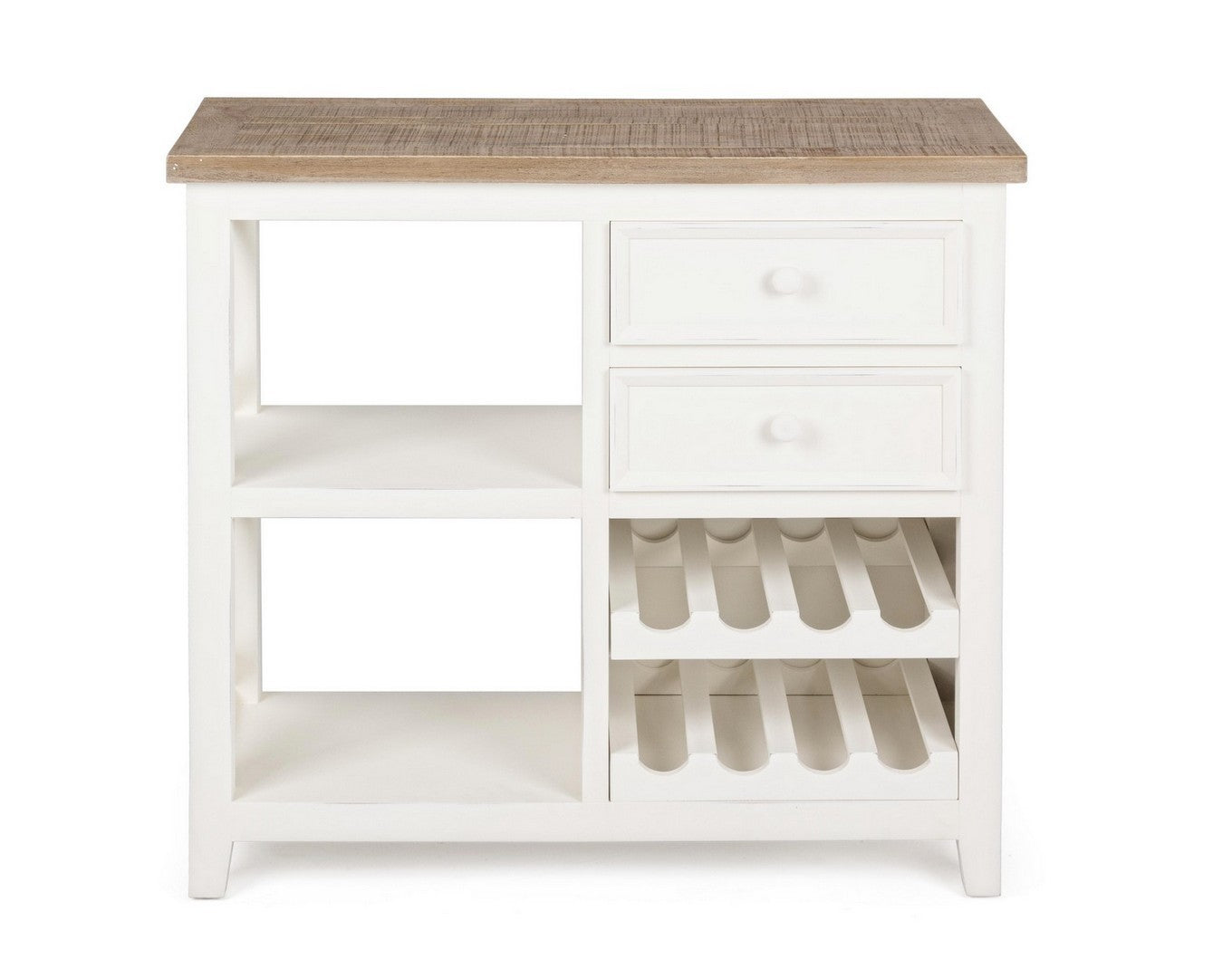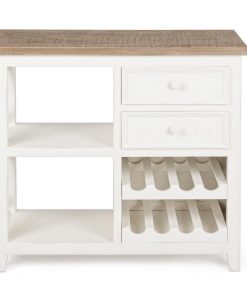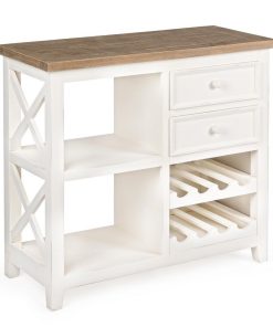 Grazioso e funzionale mobiletto multiuso, realizzato in legno colore bianco e top naturale con laterale ad incroci. Questo pratico mobile per la zona giorno si compone di 2 cassetti, 2 ripiani e vani portabottiglie, da collocare in qualsiasi stanza dalla cucina al salotto definendo uno stile country.
