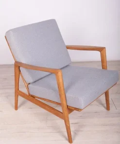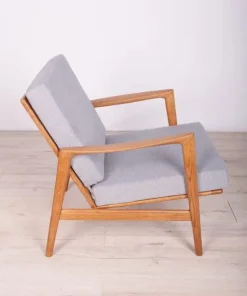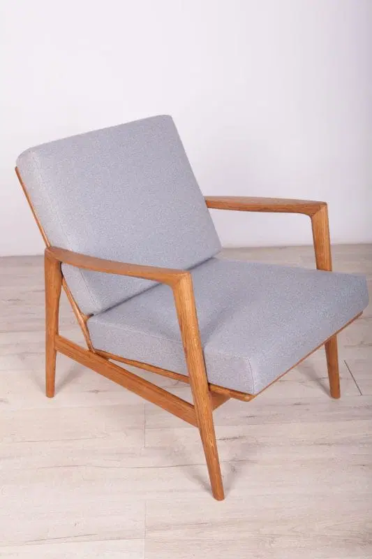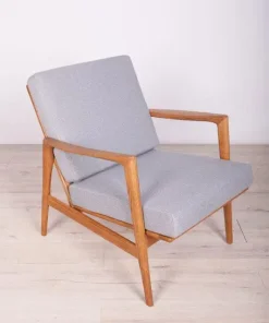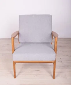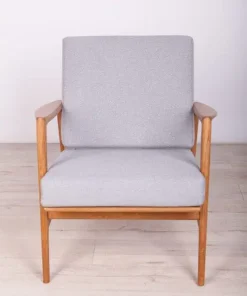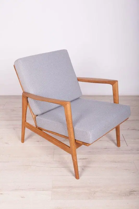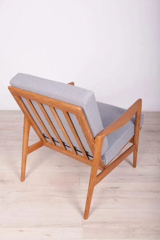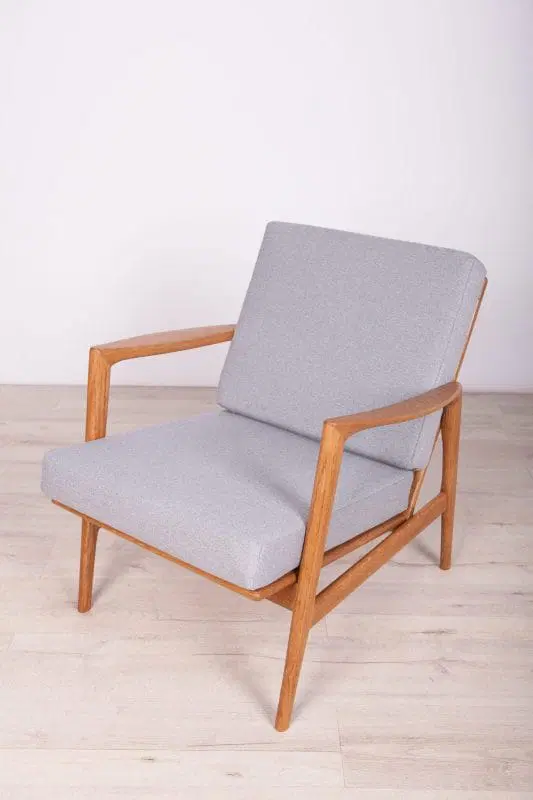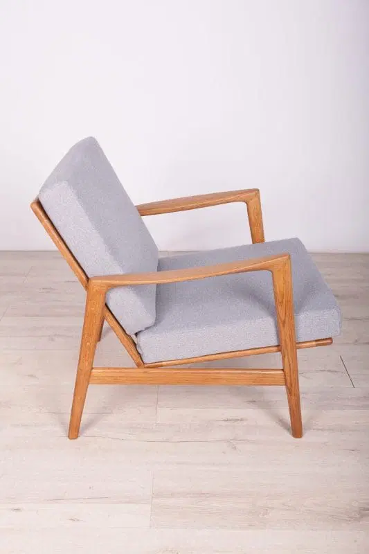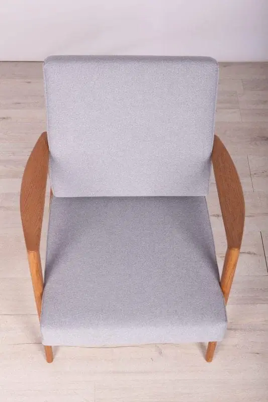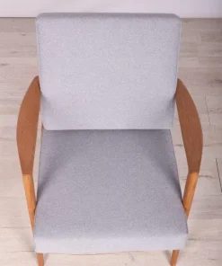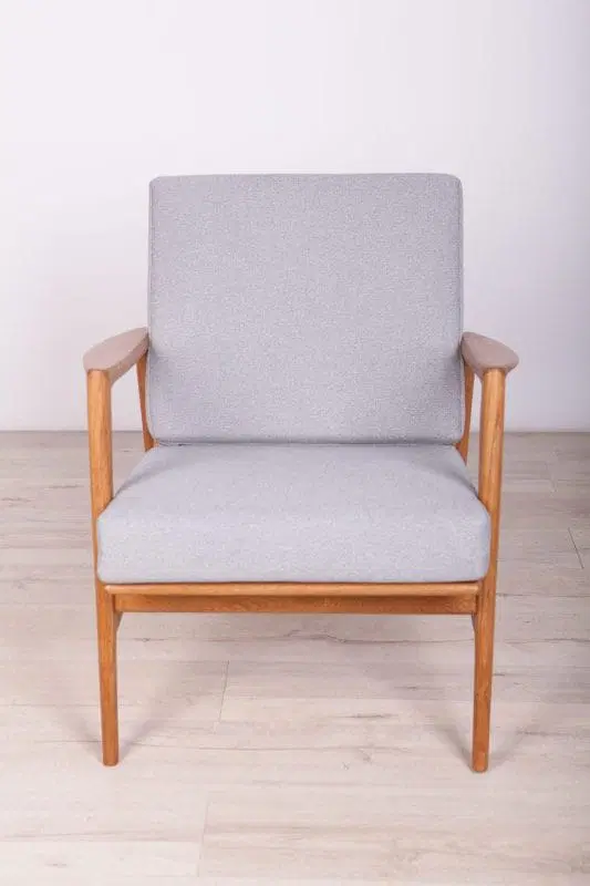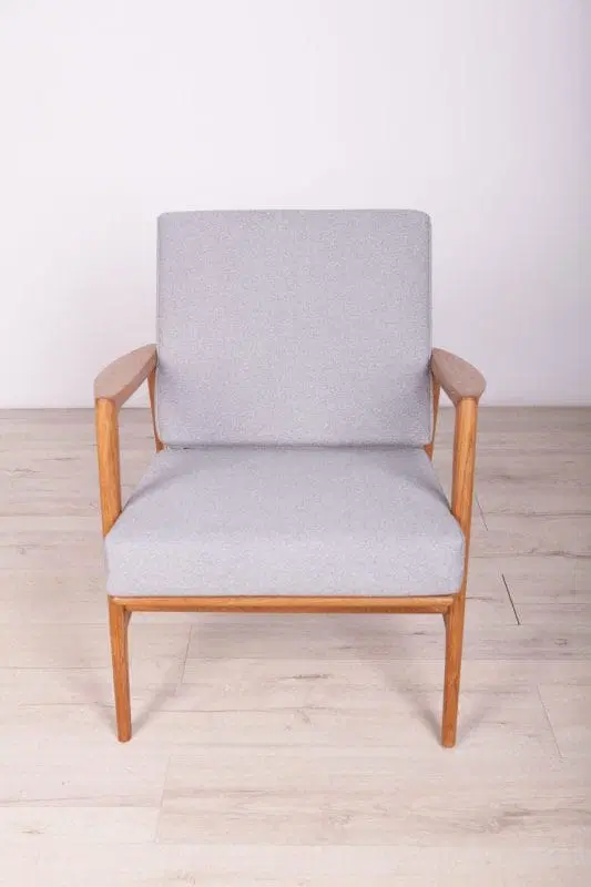 The armchair that was produced by the Polish company Swarzędzka Furniture Factory. Armchair have been professionally restored and reupholstered with gray fabric. The wooden structure has been cleaned and polished with a oak wax.