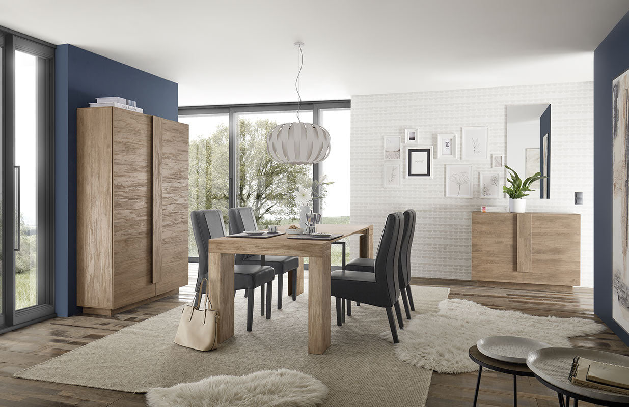 Sala completa Morelia composta da tavolo allungabile da cm 137 con allunga laterale da cm 48, credenza 2 ante e mobile armadio alto cm 193 con ripiani interni. Il nostro soggiorno moderno piace per la sobrietà del design e per una finitura calda dall’aspetto tendenzialmente naturale del legno. Morelia è un articolo Made in Italy, ideato per venire incontro a necessità diverse, mettendo a disposizione mobili versatili, funzionali e dal prezzo accessibile a tutti.