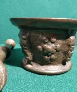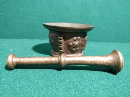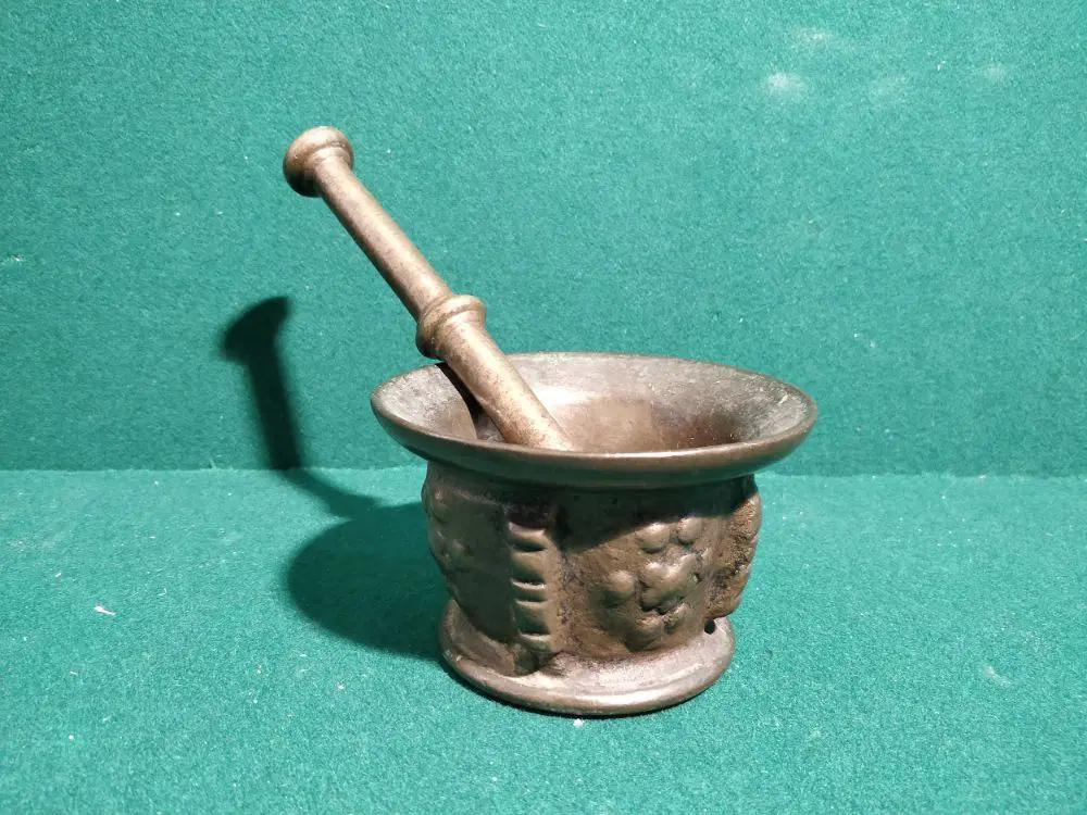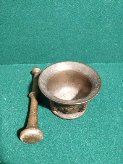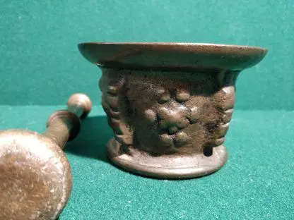 Mortaio spagnolo in bronzo, completo di pestello, epoca fine 1500/ primi 1600. Particolare lavorazione in bassorilievo, pezzo da collezione. Misure: diametro cm.12, altezza cm 7,5 ; lunghezza del pestello cm. 20.