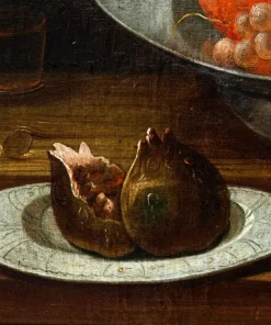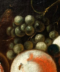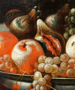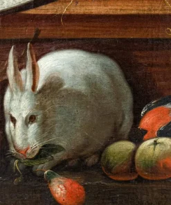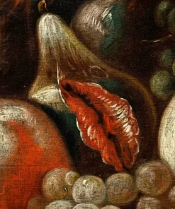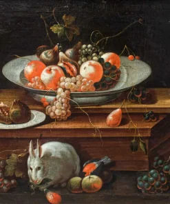 La presente natura morta è una caratteristico prodotto di scuola italiana del XVIII secolo. La composizione si snoda su tre piani ben distinti; realizzati grazie al sovrapporsi di ripiani lignei. Nel primo è raffigurato un candido coniglio e un piccolo pettirosso con uva e pere; il secondo accoglie un vado si ceramica e un succoso fico dalla polpa rossastra. Nel terzo piano l’elaborazione si fa più complessa, un grande piatto colmo di frutti, mele, fichi, ciliegie è accompagnato da due bicchieri resi con estrema meticolosità, di reminiscenza fiamminga, così come l’inserimento degli insetti che si librano nell’aria. Lo sfondo scuro permette alla composizione di risaltare maggiormente in tutta la sua complessità.