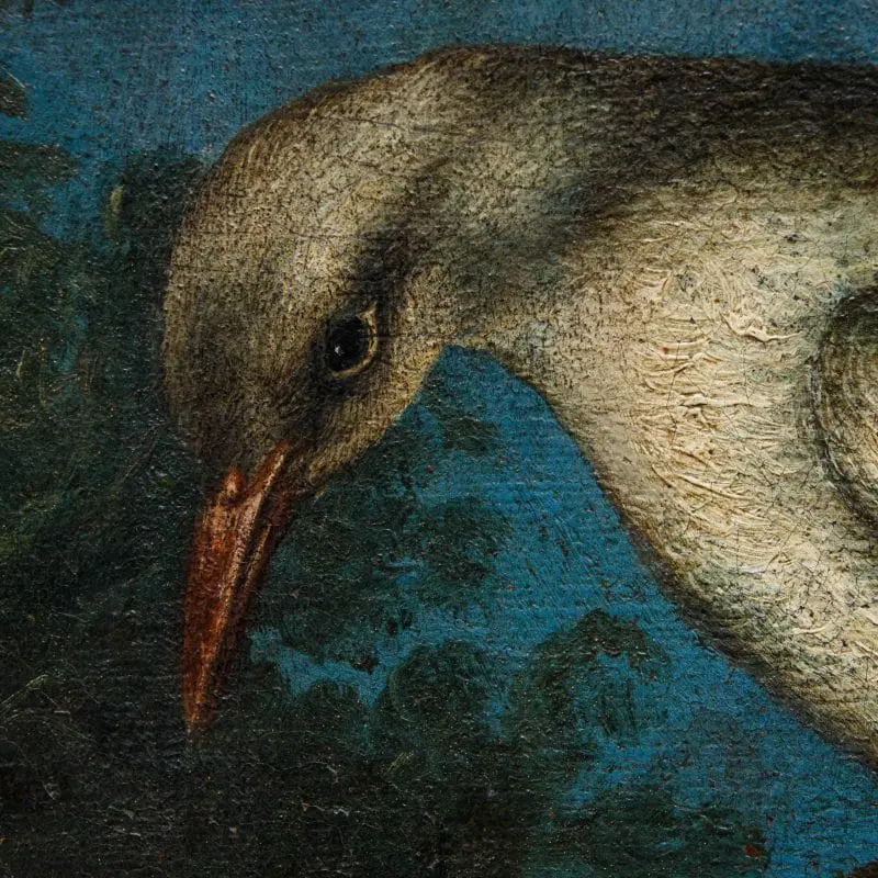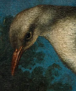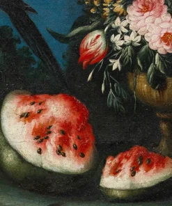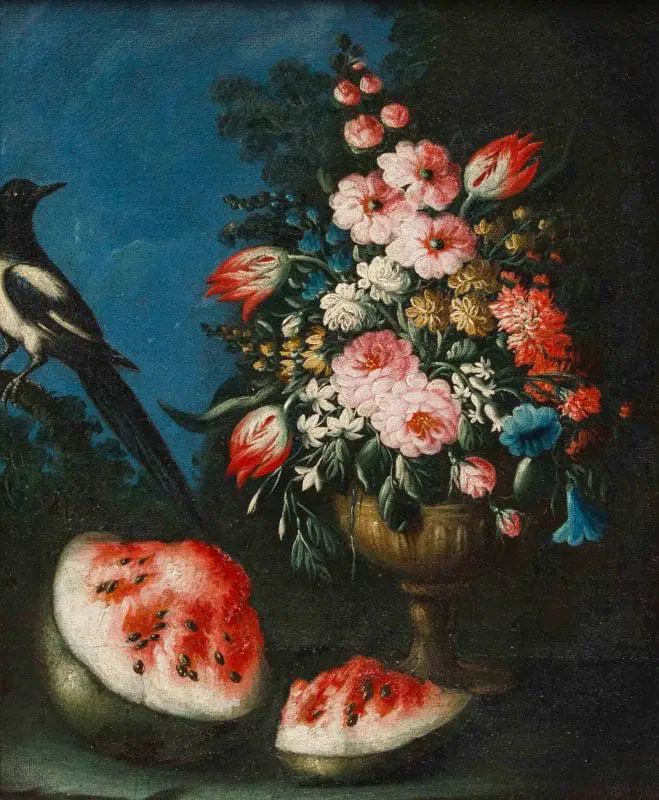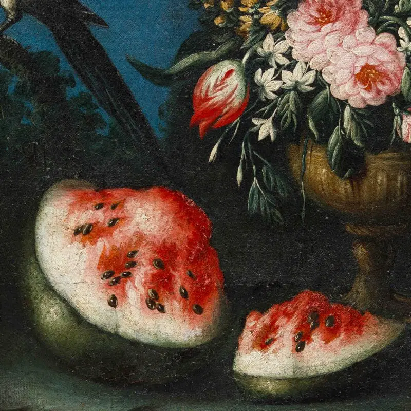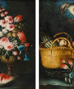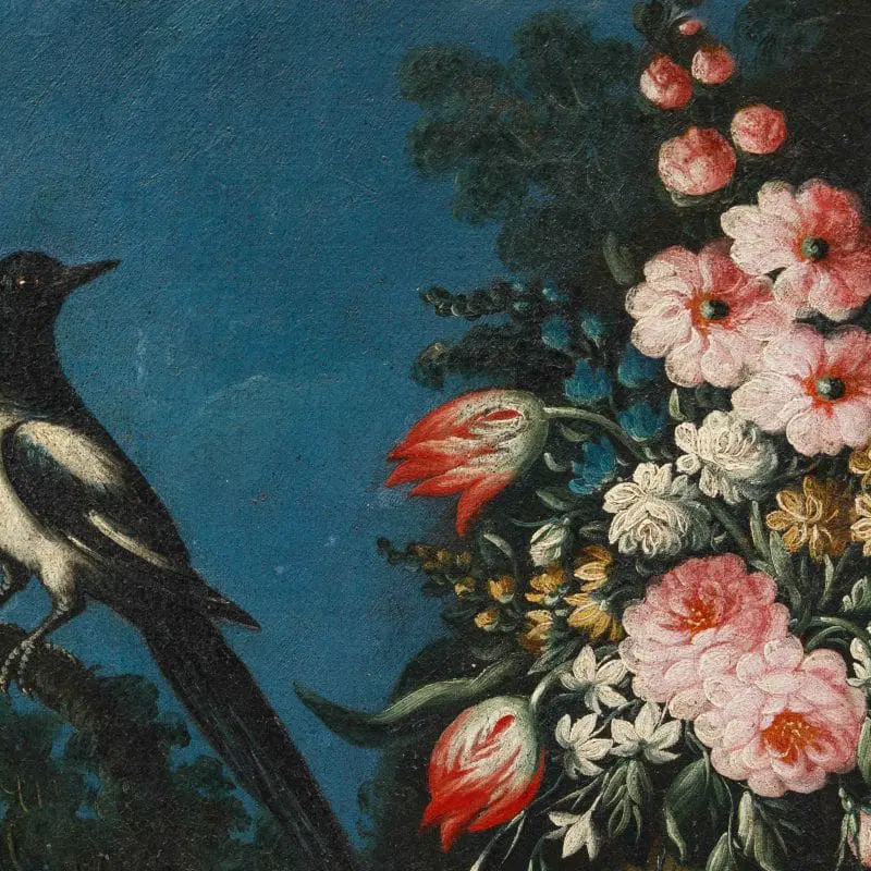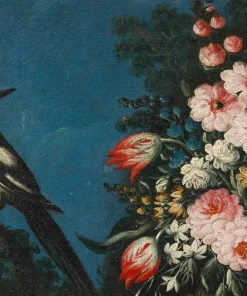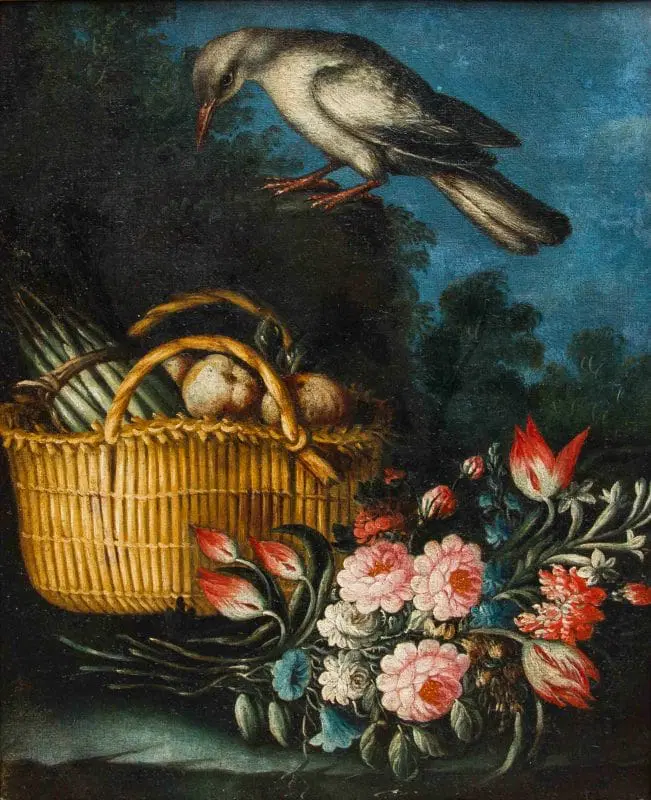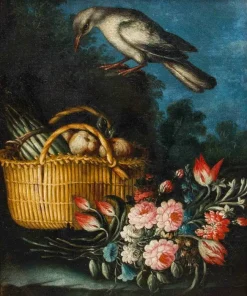 Sono noti numerosi quadri comparsi in Emilia e Lombardia nella prima metà del XVIII secolo, come evidenziano lo stile e l’impaginazione delle opere impostate su alcune costanti, come il vaso di fiori visto all’aperto, che talvolta compare anche isolato, ma che più di frequente è associato a frutta o animali domestici oppure volatili, come è il caso del nostro quadro. Qui, un piccolo volatile dal piumaggio bianco e nero accompagna un vaso di fiori, mentre un uccello bianco di maggiori dimensioni sovrasta un cesto, elemento anch’esso presente con frequenza nel repertorio dell’artista, analogamente al realistico fascio di asparagi.