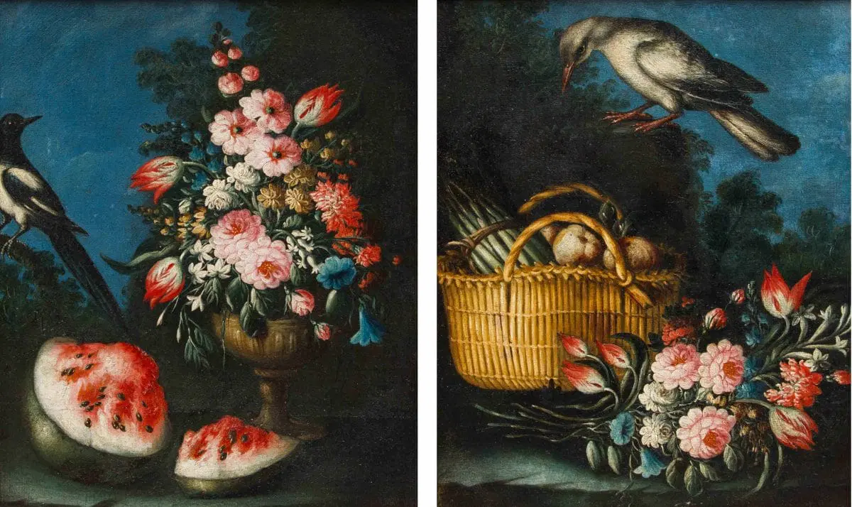 L’inconfondibile tratto stilistico della presente coppia, fatta di campiture piene di colore e tratti pastosi, permettono di ricondurre le tele alla mano del pittore Angelo Zani, noto anche come “Monogrammista A.V.” raffinato pittore di nature morte attivo nei primi anni del XVIII secolo.