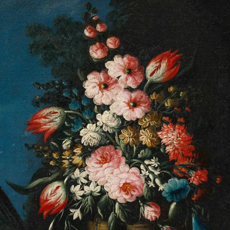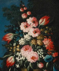 Le composizioni floreali che presentano gli stessi toni caratteristici della mano dell’artista, come la consistenza pastosa dei colori nel riempire i petali floreali e il gusto puramente decorativo, si individuano nel Vaso con fiori all’aperto in Collezione Privata, come pure nella Natura morta con vaso di fiori e uccelli su fondo di paesaggio (Finarte, Roma), in cui si può osservare il medesimo uccellino della composizione qui presente. Anche la varietà dei fiori si concentra sulle medesime tipologie, si possono pertanto evidenziare tulipani, gerbere e rose. La sua produzione è indice del favore incontrato da un genere pittorico impostato su un’amena decoratività, che spesso si osserva nelle ville della nobiltà dell’epoca.