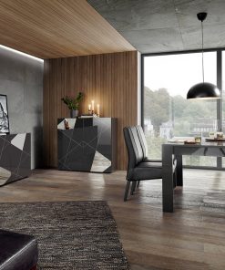 Soggiorno completo Nebraska composto da tavolo da cm 137 con prolunga laterale di cm 48, credenza alta cm 111 e madia 3 ante, tutto realizzato in legno grigio lucido. La scelta di inserire specchi sul frontale dei mobili della sala Nebraska è ciò che produce uno stile originale, fortemente elegante e che sottolinea l’orientamento contemporaneo del design, accentuato anche dalla particolare trama geometrica serigrafata sulle ante.