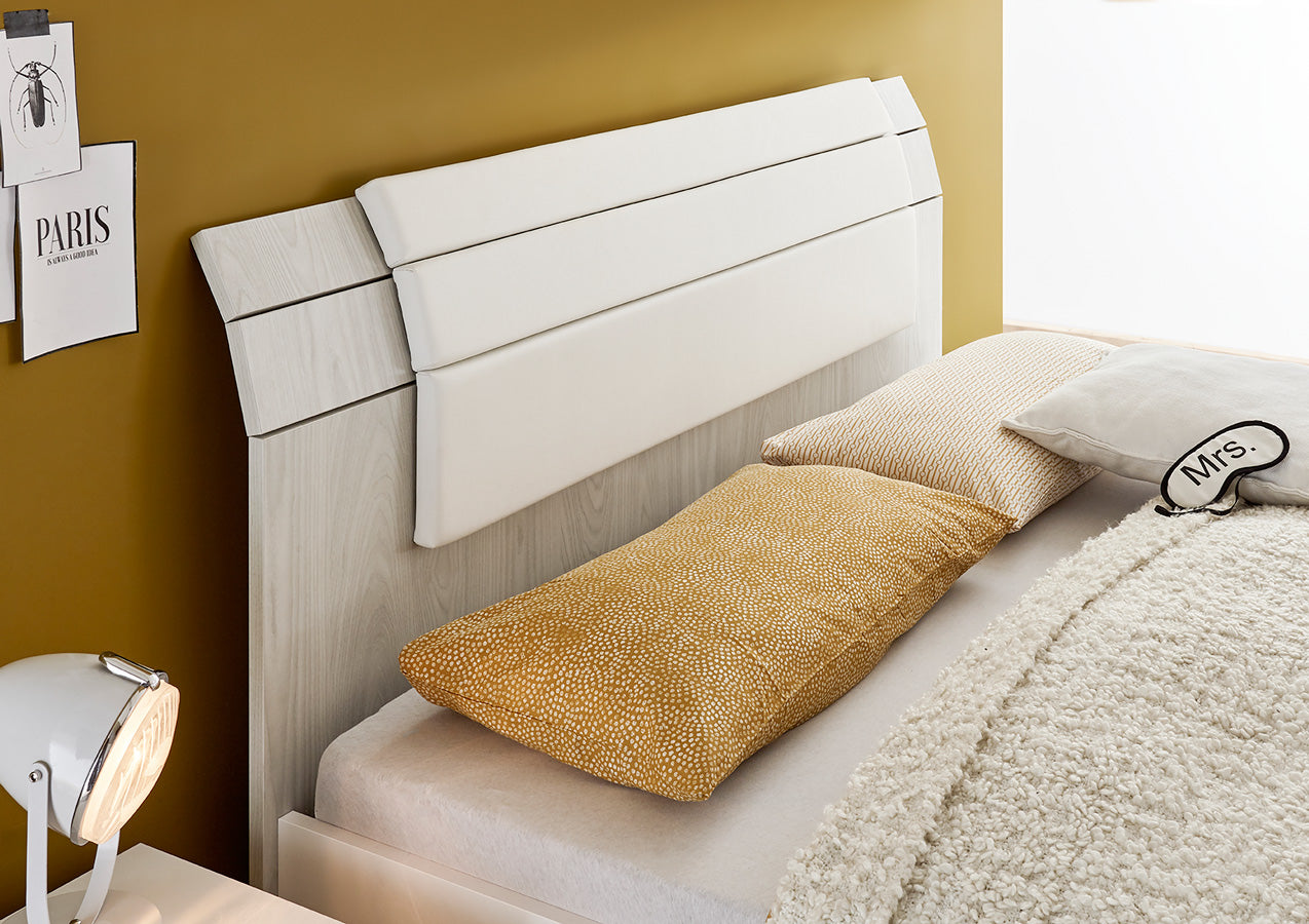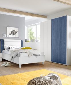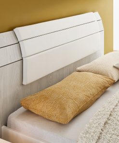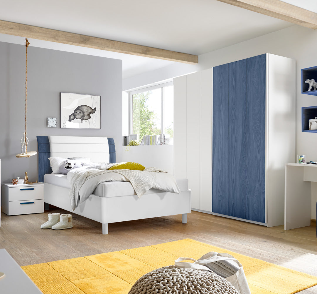 Nelide comprende un letto in legno con contenitore e cuscino come optional. Potrai scegliere il colore da abbinare al bianco opaco, come blu, grigio artico, oppure una soluzione interamente bianco opaco.