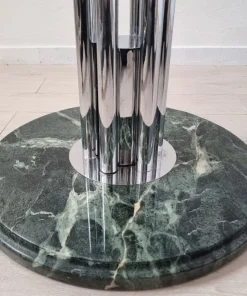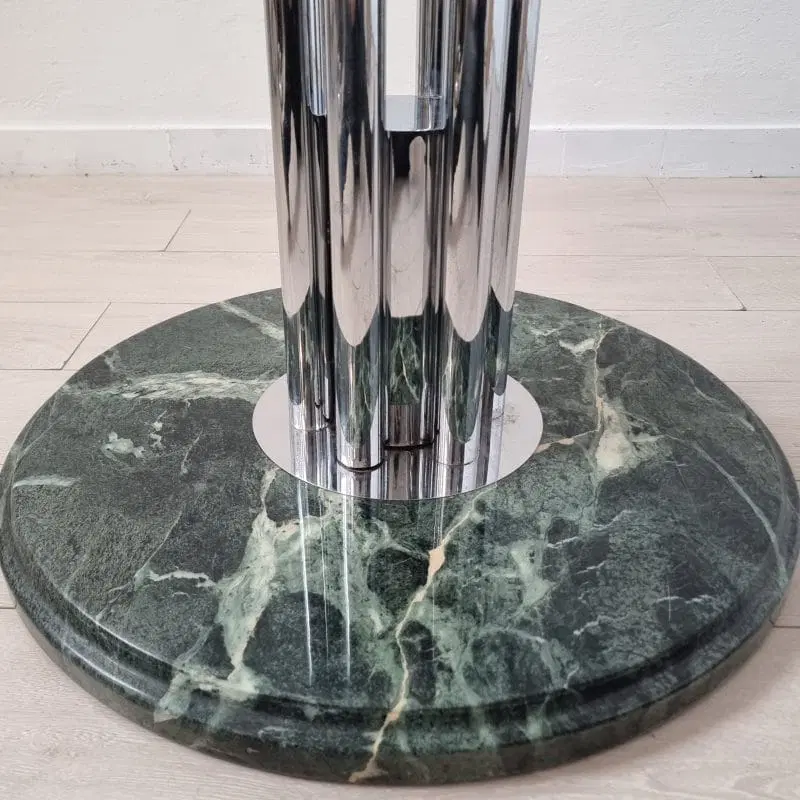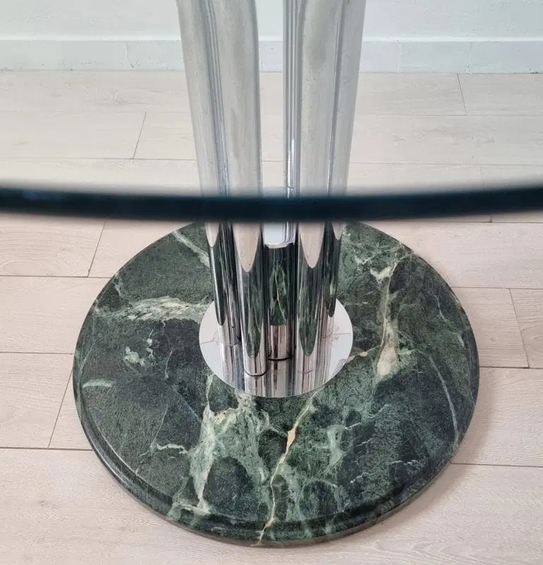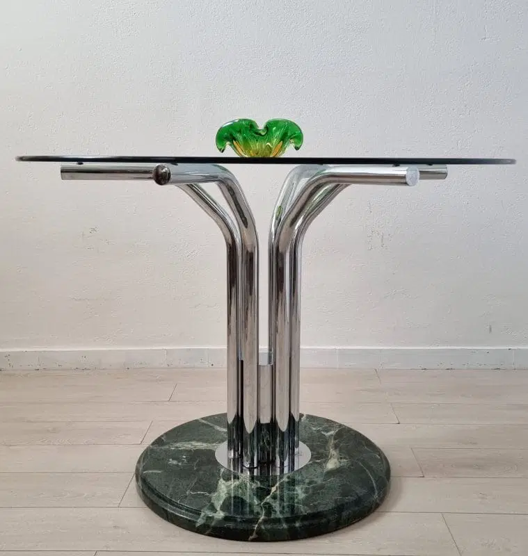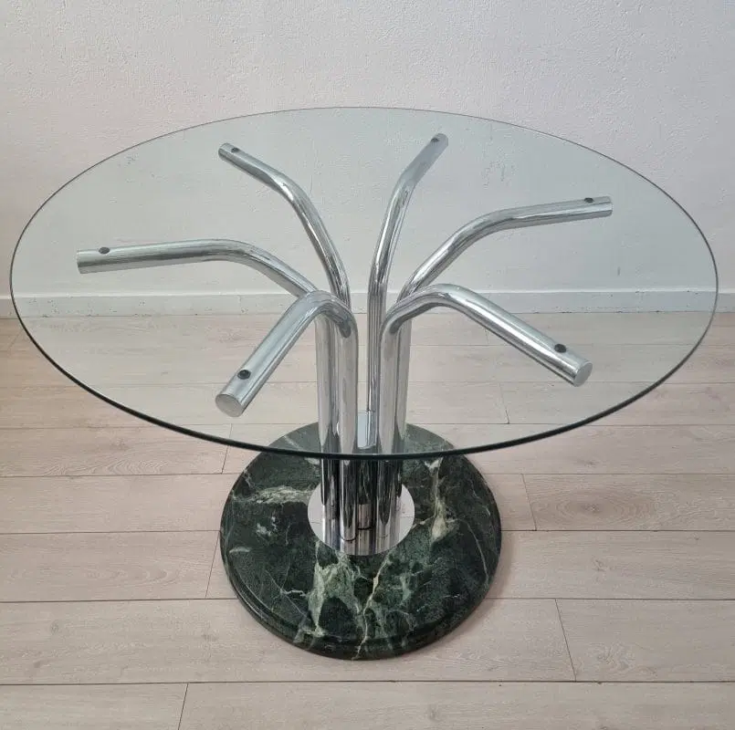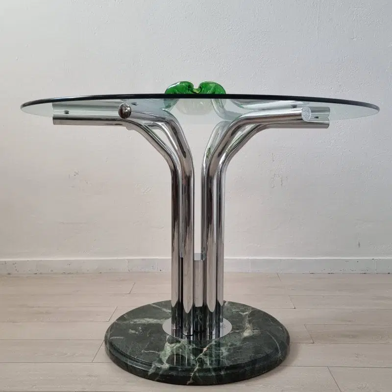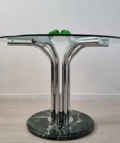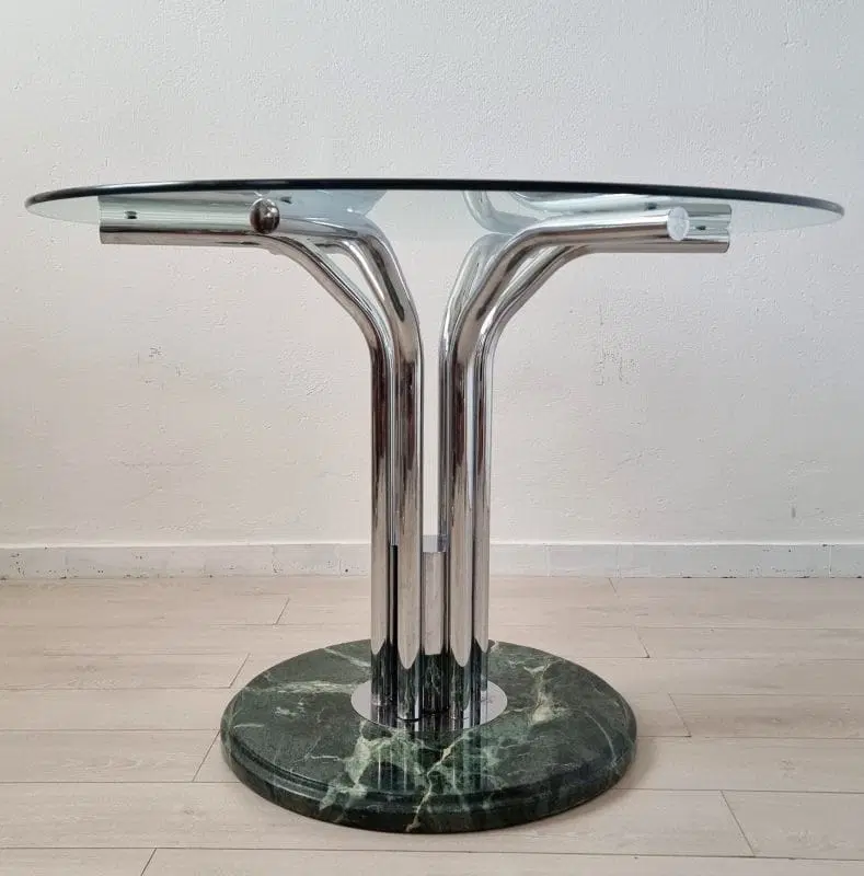 Materiali e design che identificano un epoca, un arredo che ne è un esempio, di produzione Italiana , nello stile di Giotto Stoppino ( al momento non ci sono riferimenti precisi per poterlo attribuire al designer) un bel tavolo per quattro persone, con la base in pregiato marmo delle Alpi .