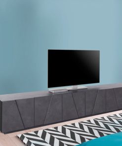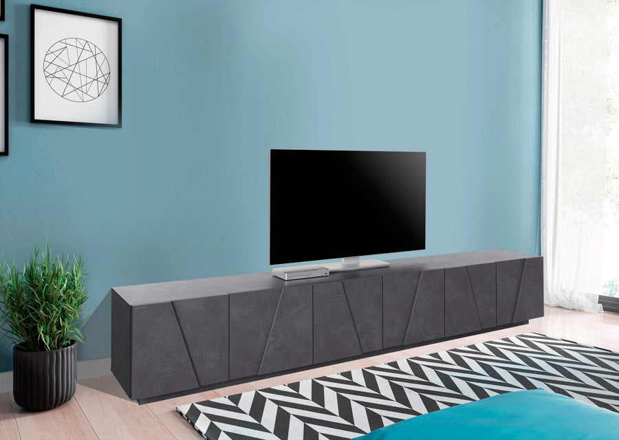 Mobile porta tv in legno, con 6 ante, disponibile nella versione ossido, bianco lucido o cemento. Dal design moderno, questo mobile è perfetto da collocare in qualsiasi tipo di ambiente, offrendo eleganza e originalità alla vostra casa.