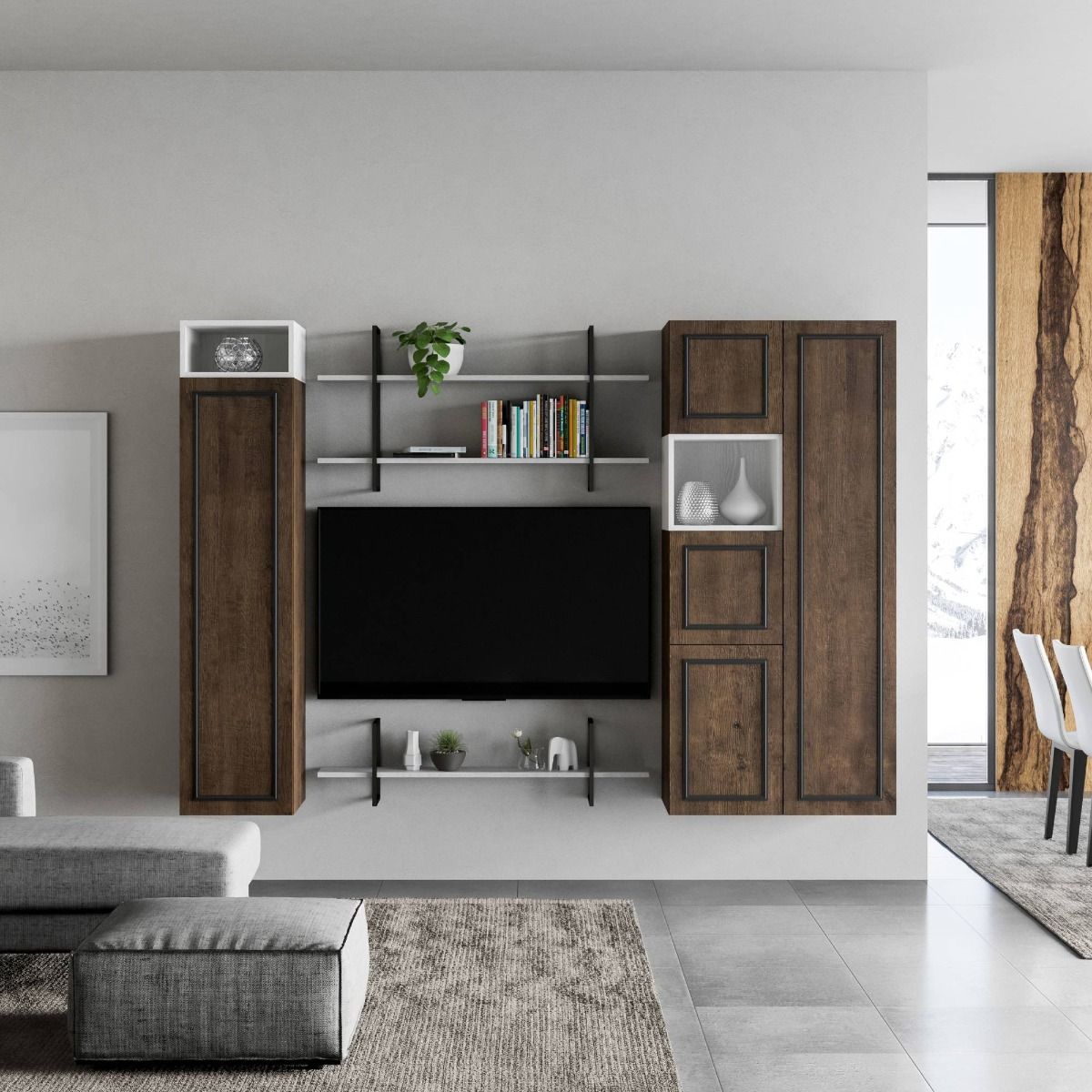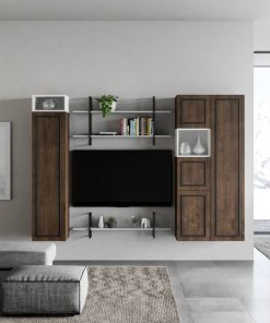 Parete design Nevis Evo composta da pensili verticali colore noce e vani bianco frassino, una soluzione alternativa e contemporanea alle più comuni pareti che si sviluppano in senso orizzontale. Nevis Evo si caratterizza per la presenza di una cornicetta antracite che accompagna i frontali creando un dettaglio innovativo e gradevole. Inoltre, è possibile aggiungere un ripiano e una libreria in ferro con mensole bianco frassino per arricchire e rendere più funzionale la composizione.