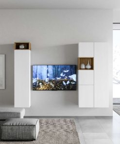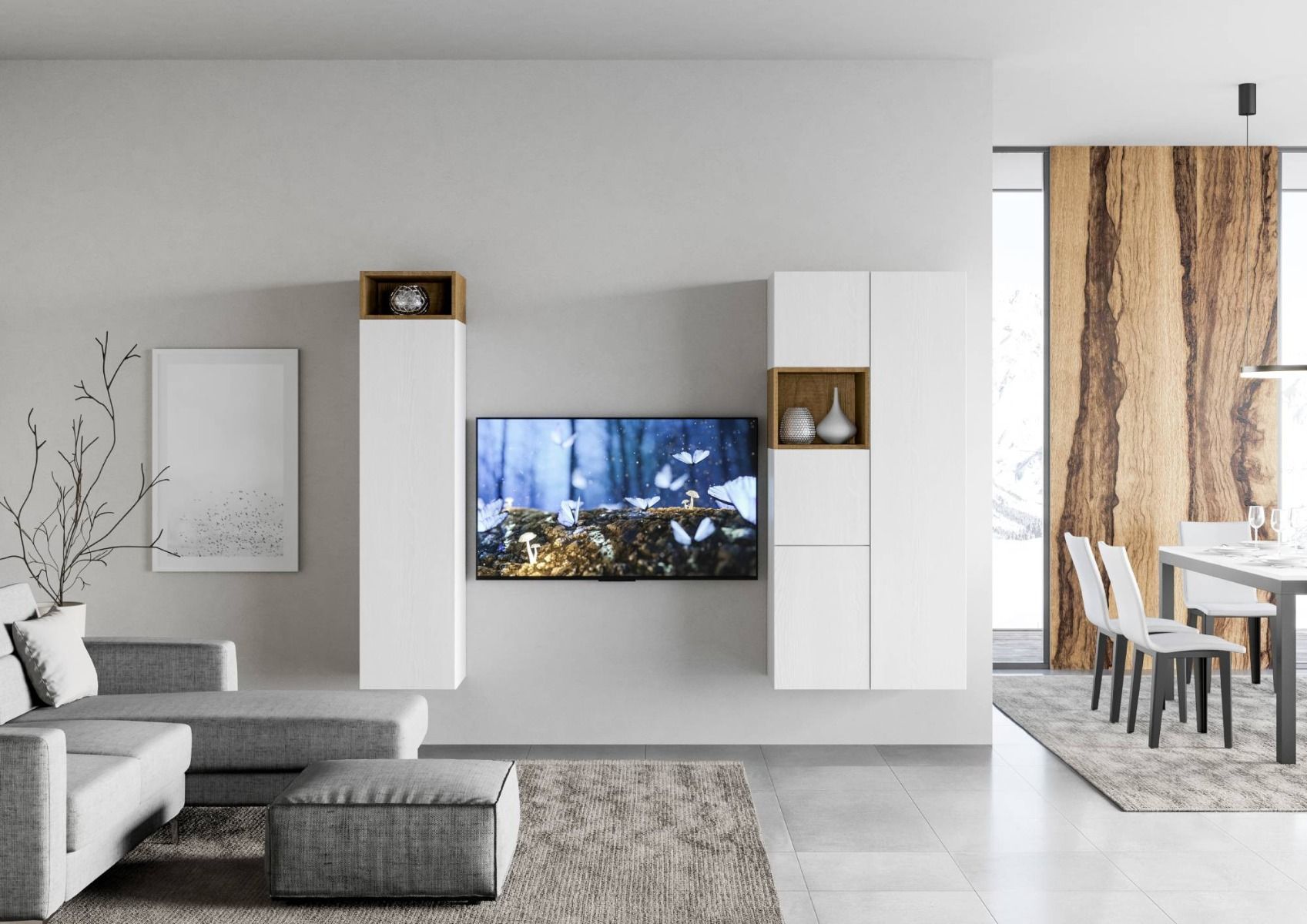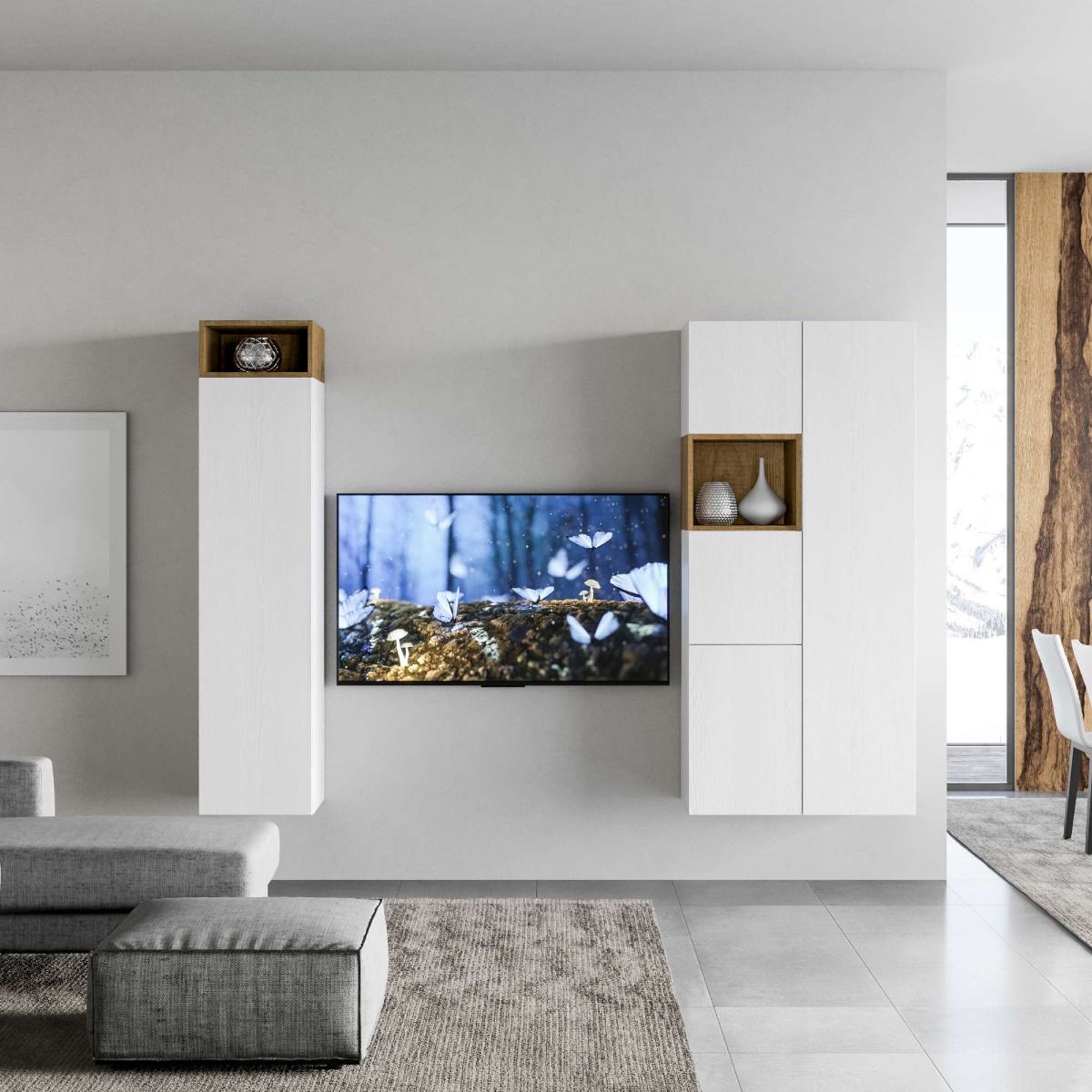 Nevis – Parete attrezzata verticale per soggiorno in legno bianco e quercia