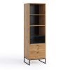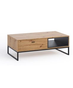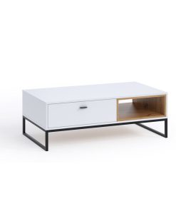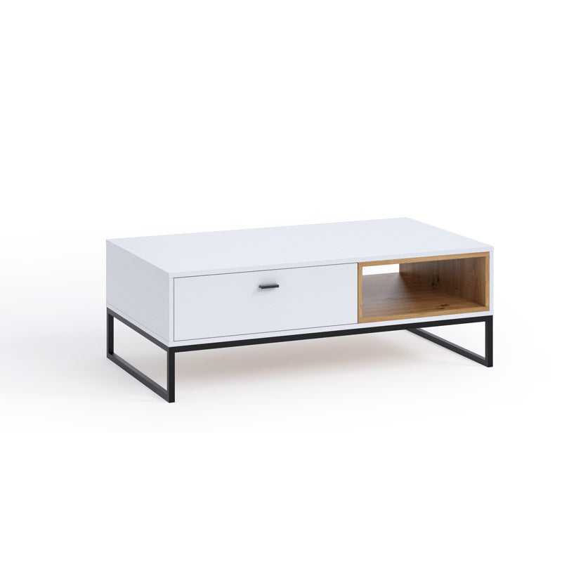 Tavolino da salotto rettangolare realizzato in legno e composto da cassetto e vano laterale. Lo stile industriale del nostro tavolino moderno si evince nella scelta delle finiture e nel design essenziale, che realizza comunque un elemento pratico e versatile. Il tavolino è disponibile in due varianti, con bianco o nero opaco abbinato alla finitura naturale del legno.