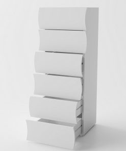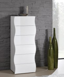 Cassettiera colore bianco lucido, con 6 cassetti contenitore. Realizzata seguendo uno stile moderno, la cassettiera si presenta in tutta eleganza, non solo grazie al suo colore raffinato, che mette in risalto il mobile, ma anche e soprattutto per le sue forme ondulate, le quali donano una certa finezza e grazia alla cassettiera.
