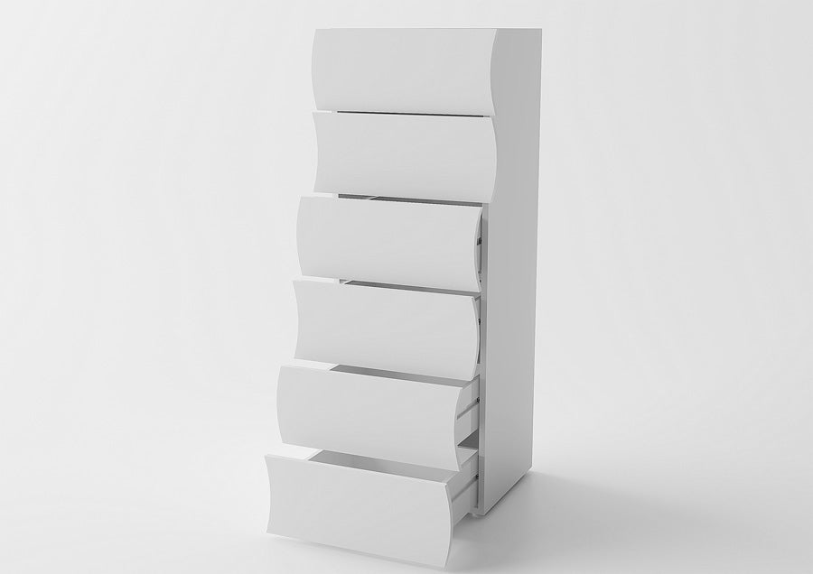 Particolare cassettiera, realizzata nella colorazione bianca lucida, dotata di 6 cassetti porta oggetti, dalla forma sagomata ad onda, una caratteristica particolare e moderna, la quale rende il mobile elegante e perfetto da collocare in qualsiasi stanza, per un arredamento originale. Da abbinare anche agli altri complementi della stessa linea, per arredare la vostra casa con stile.
