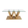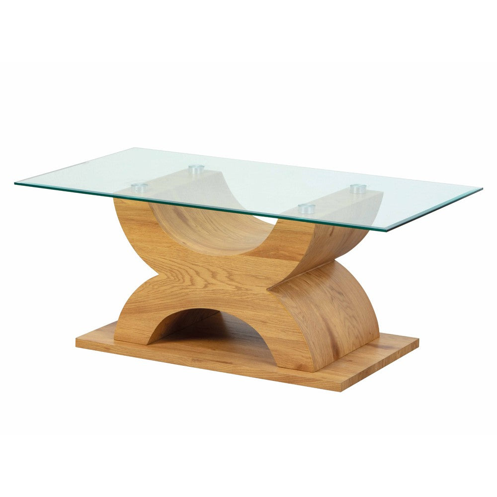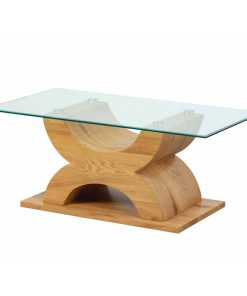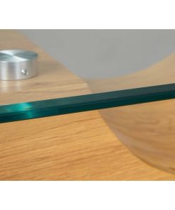 Tavolino da salotto rettangolare elegante con un design sofisticato, distinto dal connubio legno naturale e vetro, sempre di notevole effetto estetico. Infatti, questo tavolino design si compone di ampia base realizzata in legno definita da due elementi semicircolari che sorreggono il piano in vetro trasparente.
