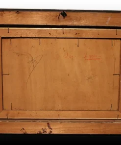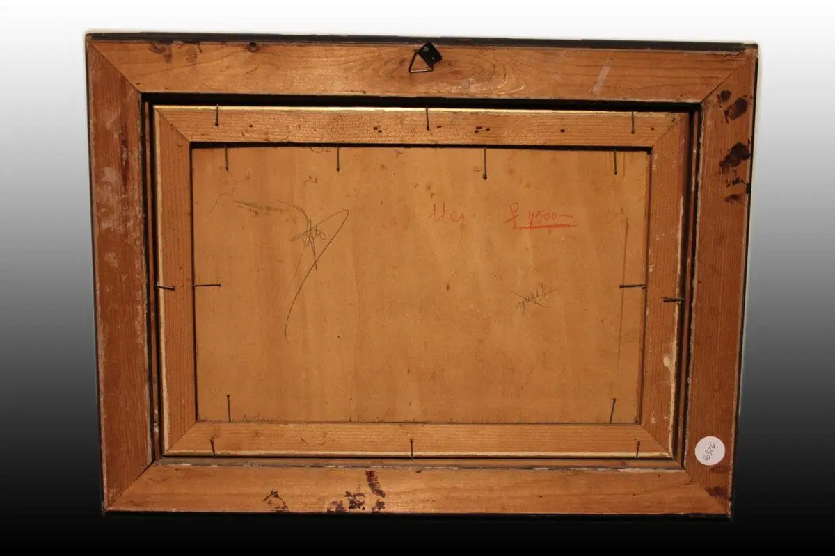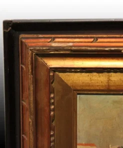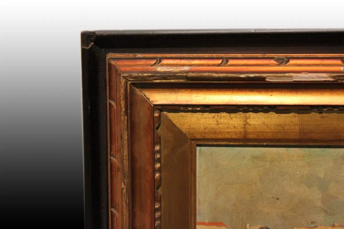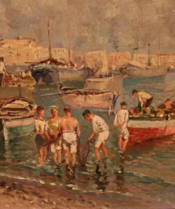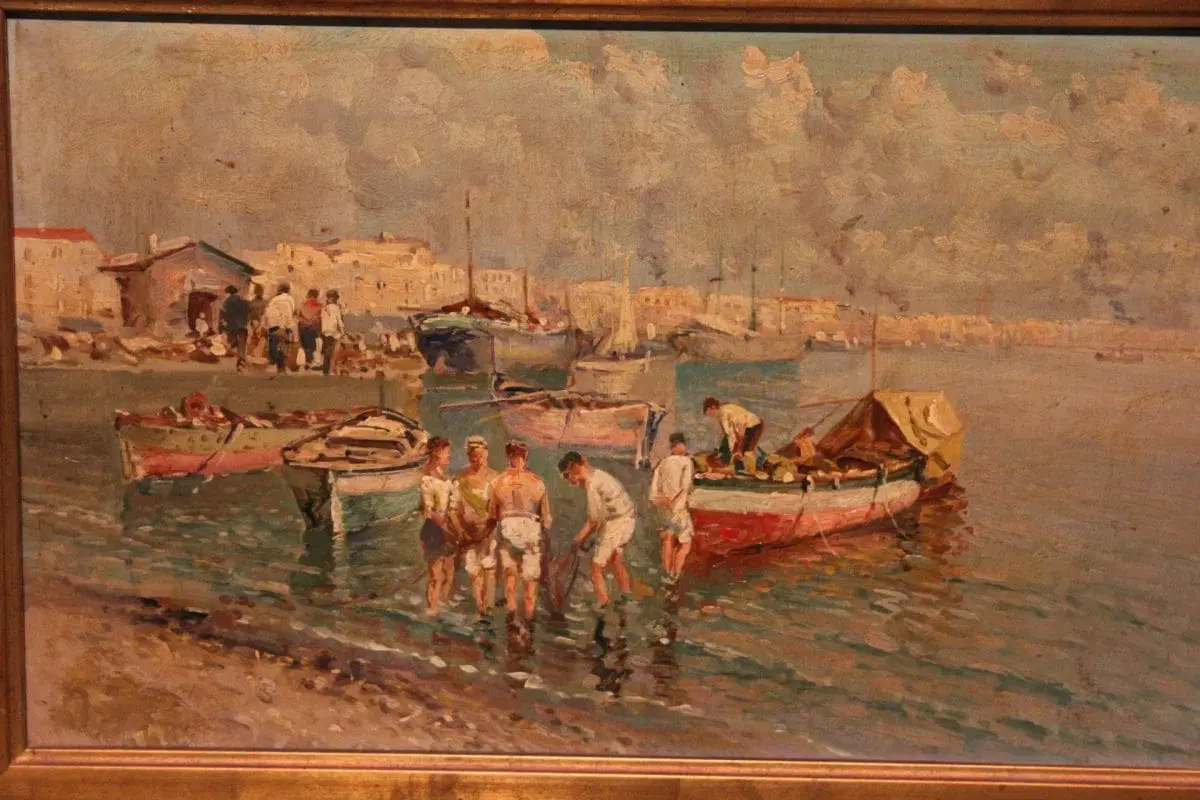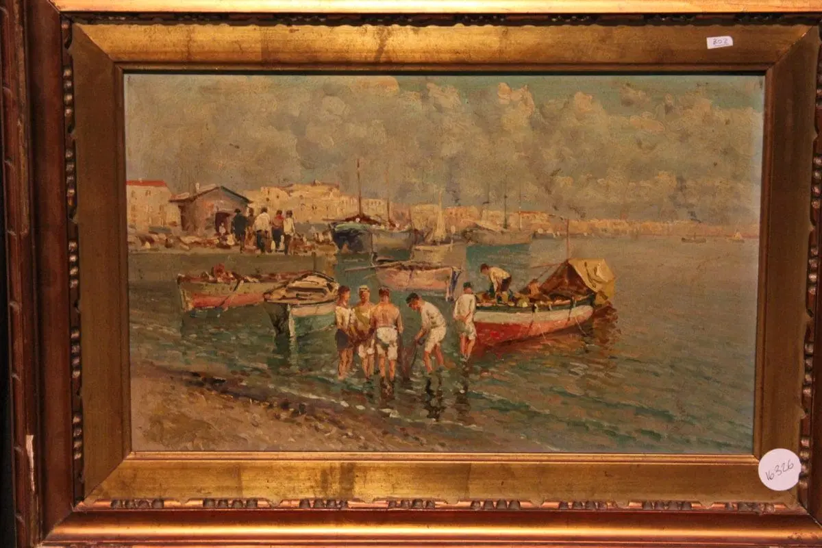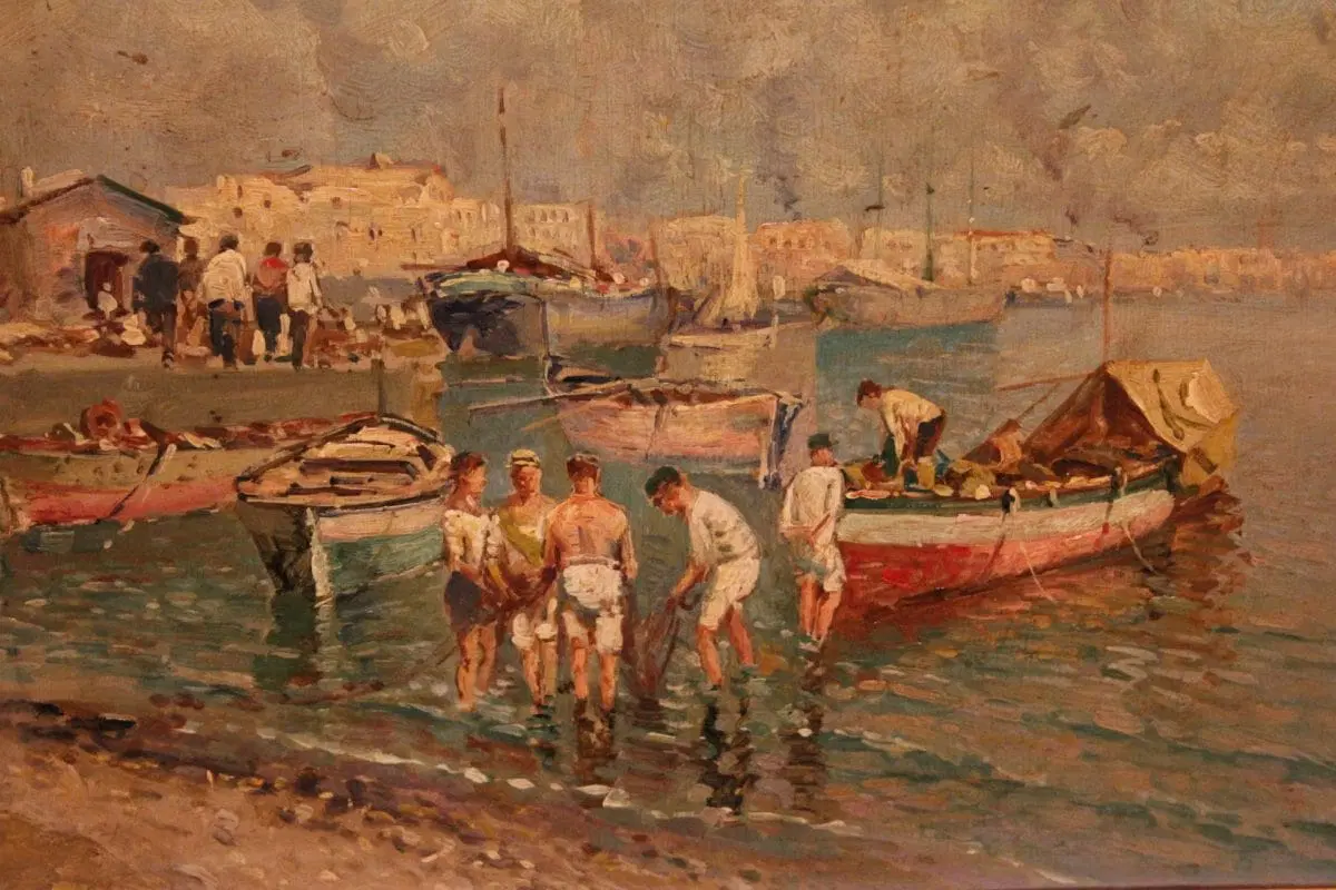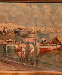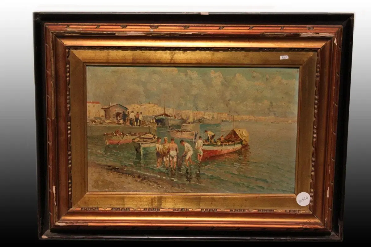 Olio su tavola italiano di fine 1800 raffigurante Porto con Barche e Pescatori. Raffigurato affascinante scorcio marino con barche e pescatori in un pittoresco porto con veduta di cittadina sullo sfondo. L’opera, realizzata con la tecnica dell’olio, si distingue per la sua raffinatezza artistica e il dettaglio delle imbarcazioni. Cornice dorata e laccata coeva.