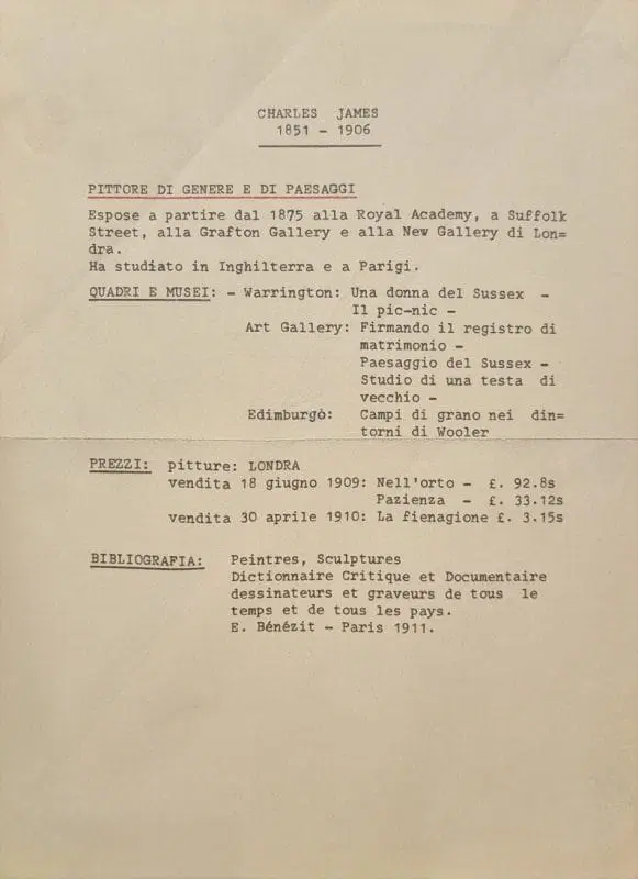 Charles James fu un pittore britannico attivo tra la metà dell’Ottocento e i primi del Novecento, noto per la sua capacità di catturare scene di vita quotidiana, ritratti e paesaggi con una sensibilità pittorica rara. Le sue opere sono oggi molto ricercate dai collezionisti, sia per il valore storico che per la qualità tecnica.
