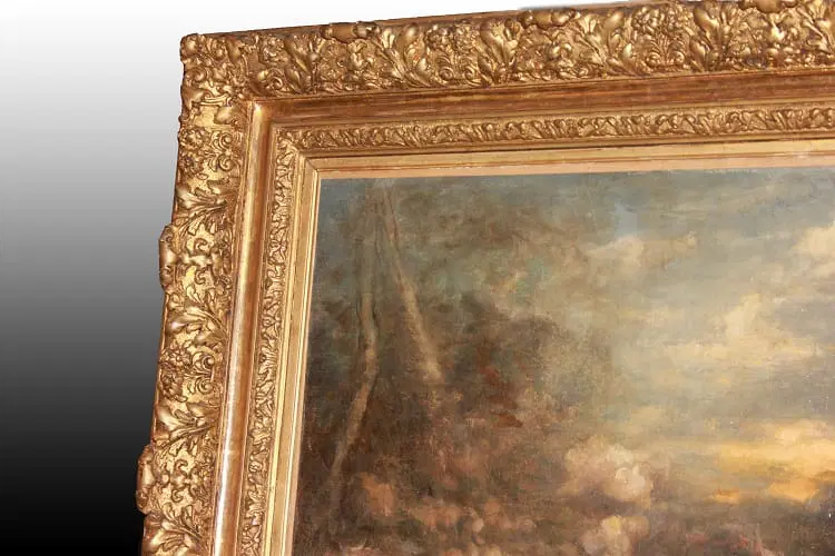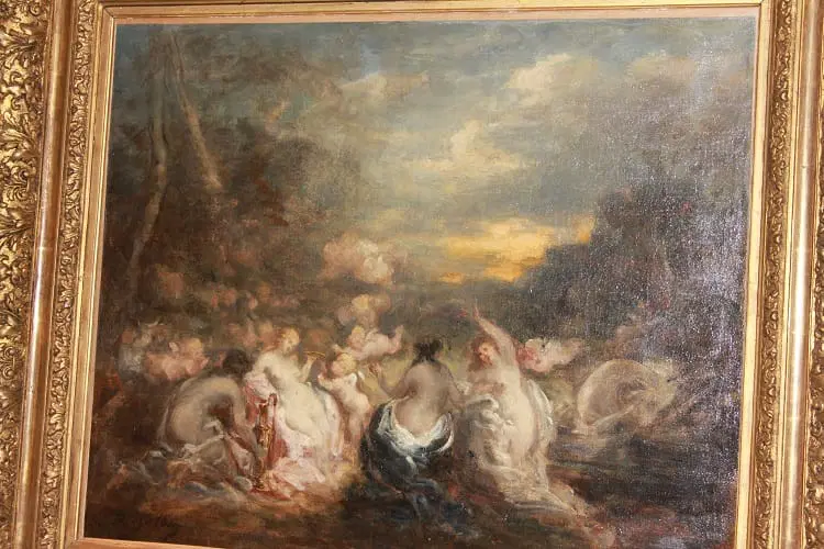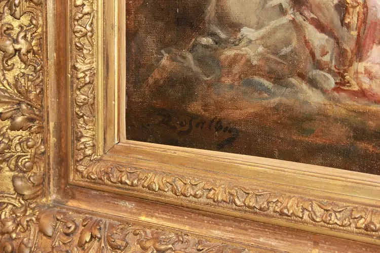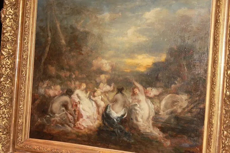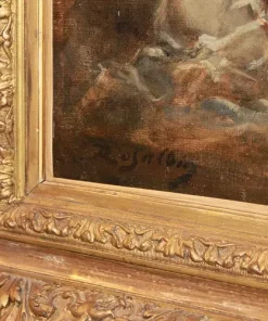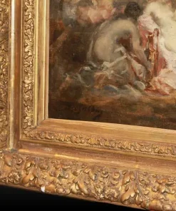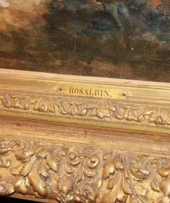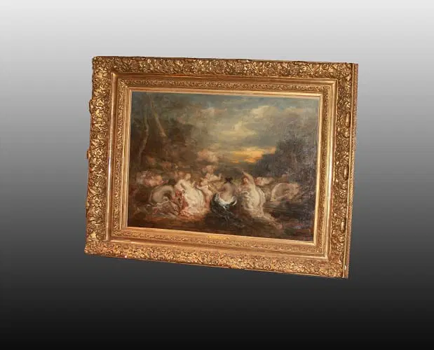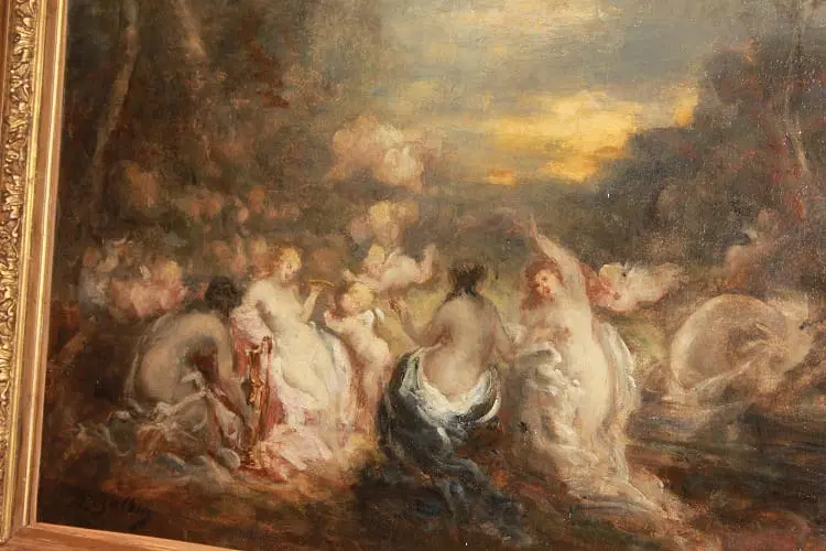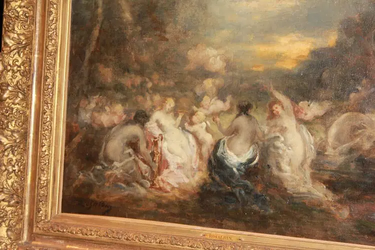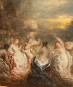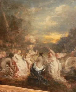 Olio su tela francese di metà 1800 raffigurante Baccanale con Ninfe firmato Marie – Abraham Rosalbin de Buncey 1833 – 1891, famosa per i suoi paesaggi boschivi scuri combinati con radure luminose e donne nude e/o Venere (nello stile di Narcisse Virgilio Díaz). Il tema, ripetutamente affrontato dall’artista, si sposa perfettamente con l’accademismo dal sapore pagano del pittore, evidenziando la sua predilezione per forme levigate e sensuali, così come le sottili esplorazioni del ritmo e le licenze “pittoresche”.