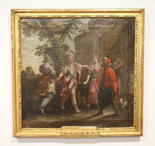 Olio su tela italiano del 1700 in prima tela. Raffigurata scena con 5 personaggi, all’aperto, di cui 2 femminili e 2 cani. Sullo sfondo abitazioni. Cornice antica in legno dorato.