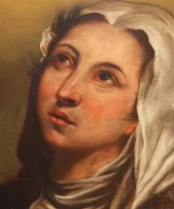 Olio su tela italiano di inizio 1800 ispirato a Federico Barocci (1535 – 1612) raffigurante ritratto di Michelina da Pesaro. Michelina da Pesaro è stata una religiosa italiana, terziaria francescana e fondatrice della confraternita della Santissima Annunziata. Il suo culto come beata è stato confermato da papa Clemente XII nel 1737.