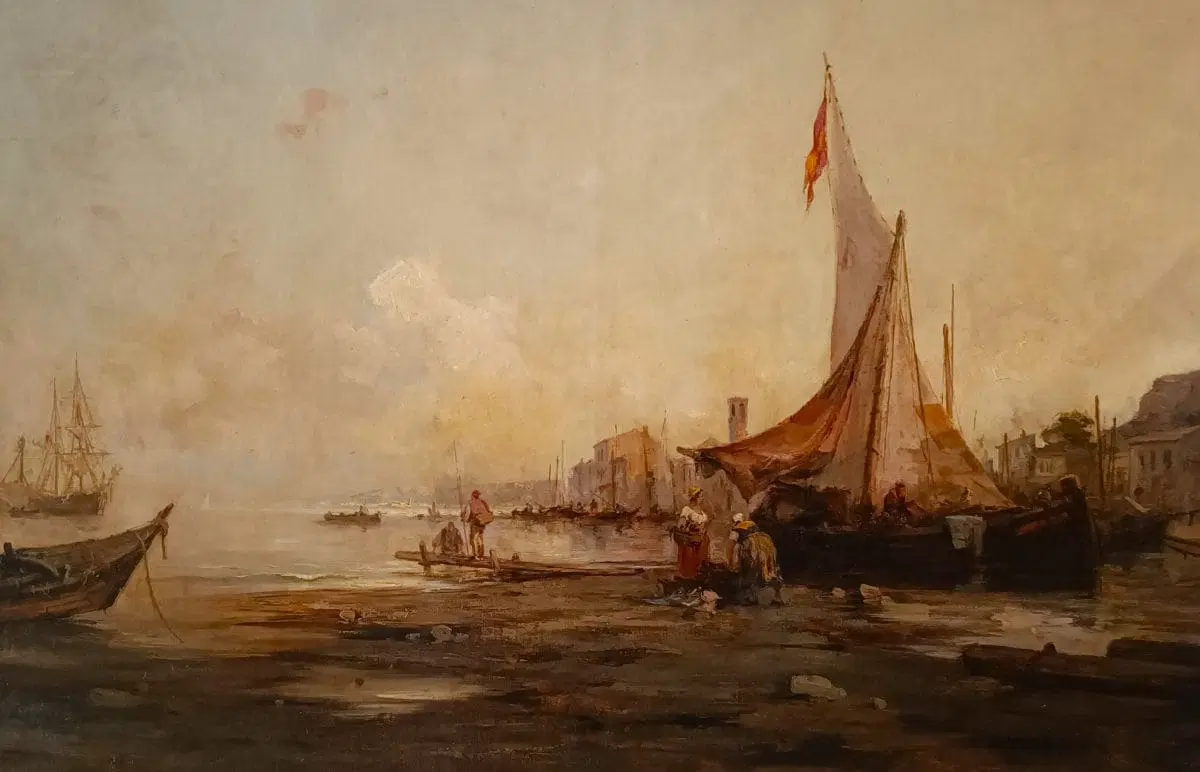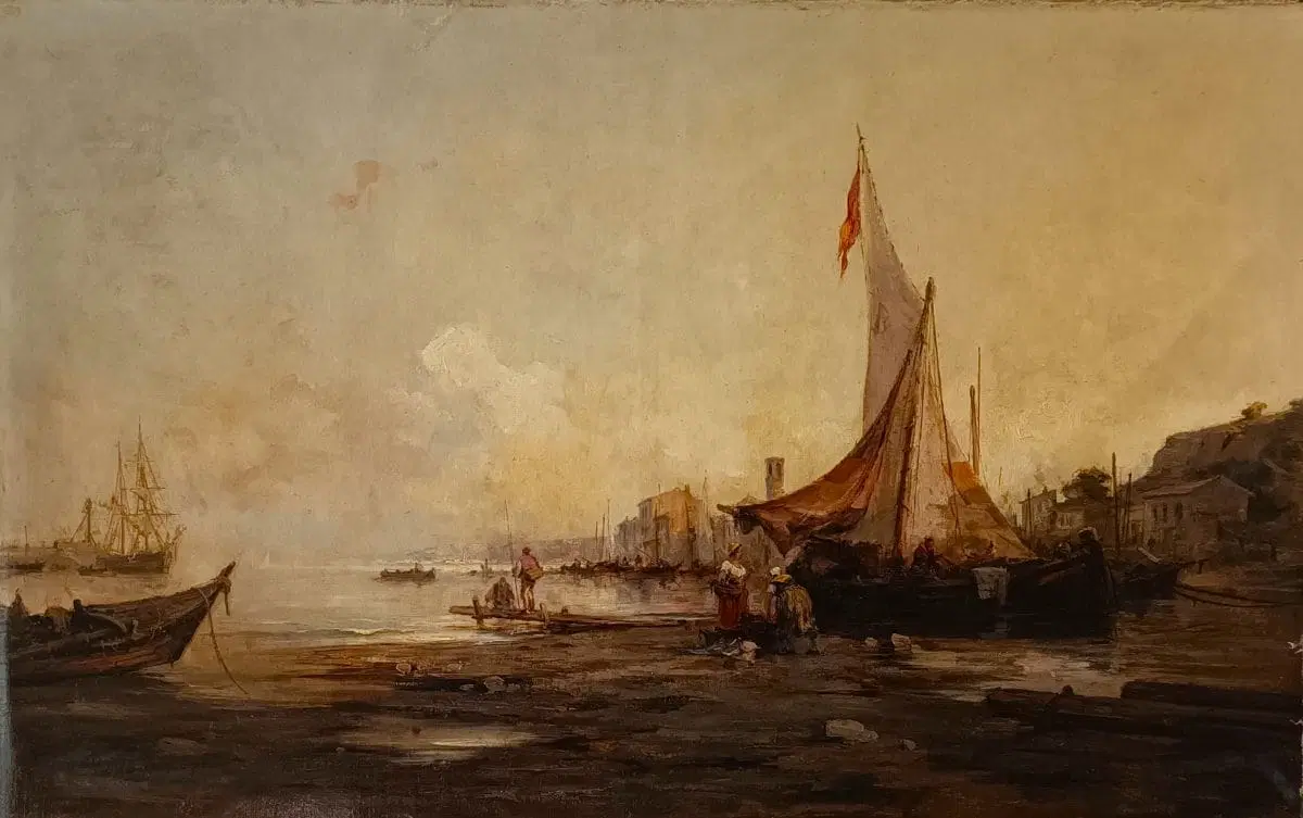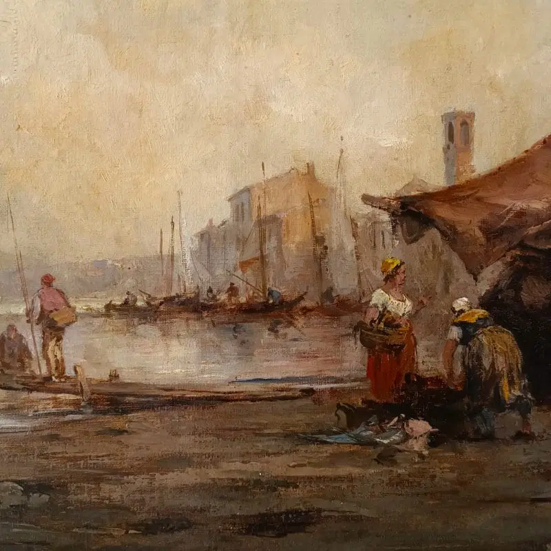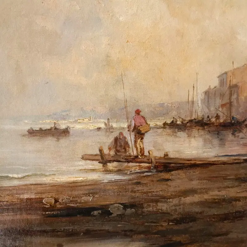 Olio su tela Marina con Laguna di Venezia datato 1877