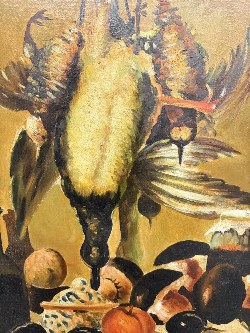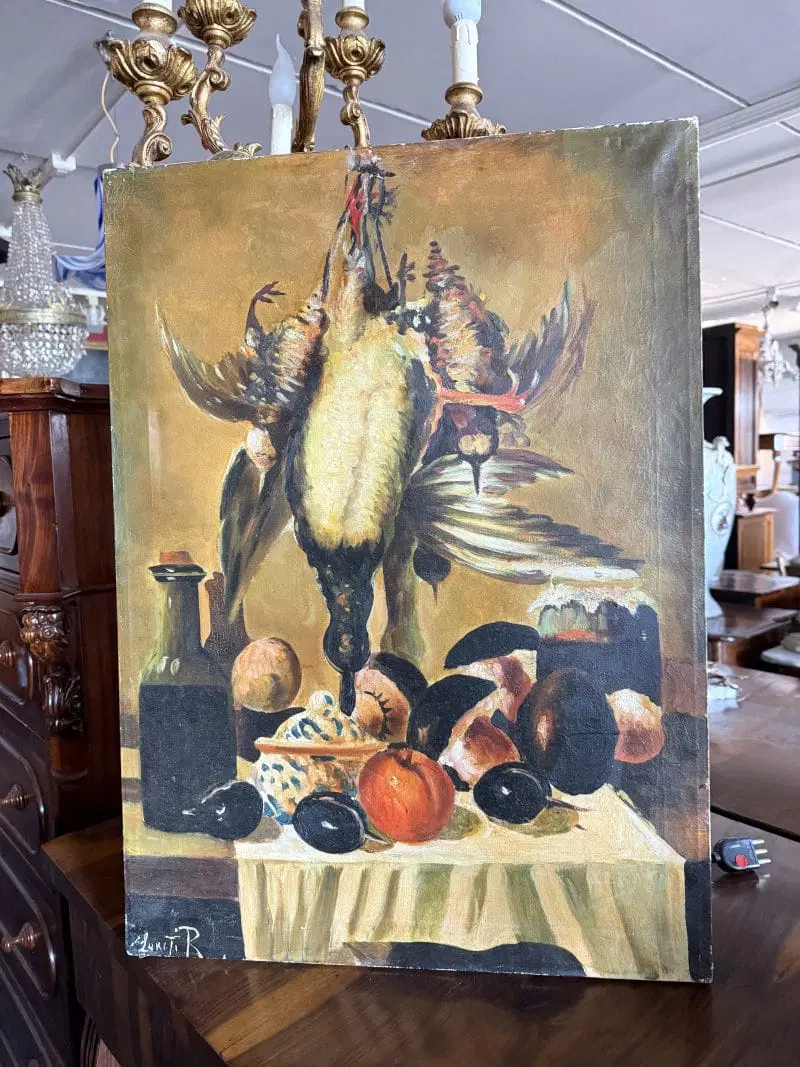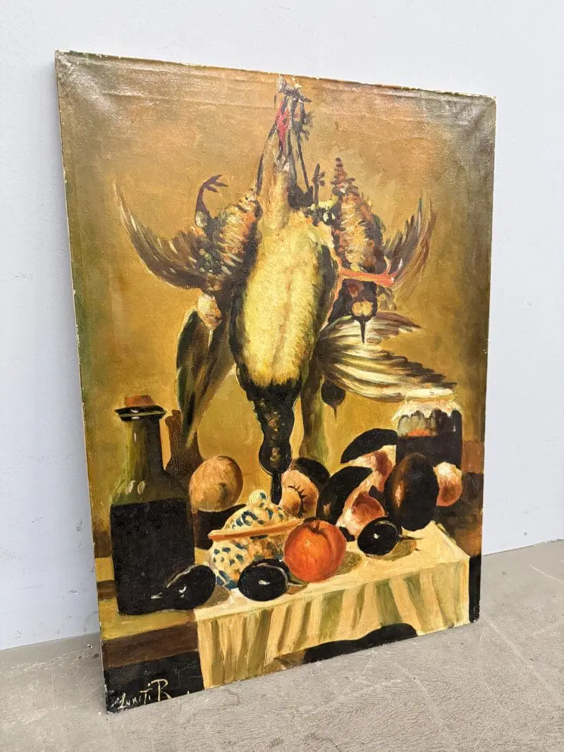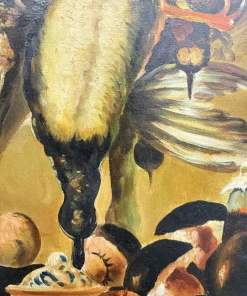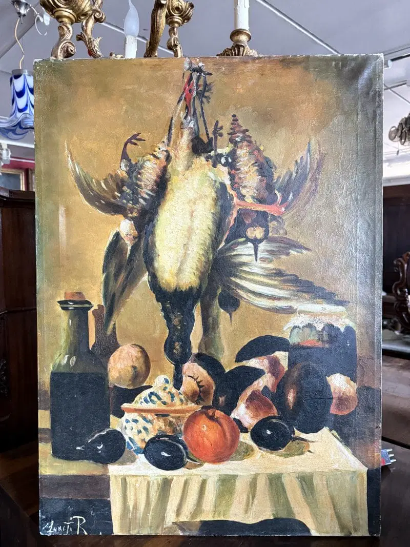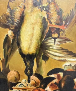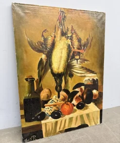 Olio su tela raffigurante natura morta e cacciagione XX sec., 70×51 cm, firmato. Scuola italiana