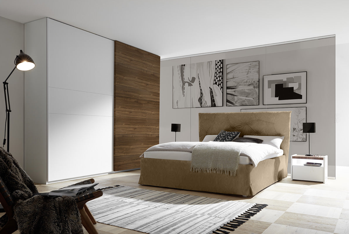 Camera matrimoniale completa di letto da cm 160, armadio Artelio da cm 220 e coppia di comodini realizzata in legno bianco e noce dark. La camera moderna Optima propone un’idea esteticamente sobria ma ricercata, basata su linee moderne e forme essenziali. Il letto moderno Albatros si caratterizza per il rivestimento in ecopelle colore tabacco con una testiera lavorata che fa emergere l’imbottitura, mentre l’armadio con 2 ante scorrevoli mette a disposizione capienza, infine i due comodini sono strutturati con cassetto e vano a cui potrai aggiungere una luce a led.