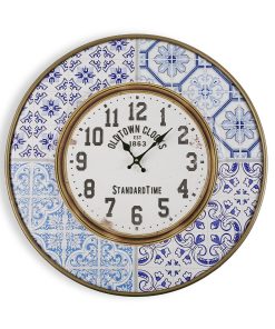 Orologio da parete dalla forma tonda realizzato interamente in metallo seguendo uno stile vintage i cui tratti sono i colori chiari accostati alle cornici scure poste intorno al quadrante ed attorno all’intero elemento, la scelta delle 4 diverse fantasie usate per decorare l’orologio e lo stile dei caratteri stampati sul quadrante, coperto a sua volta da uno strato protettivo in vetro.