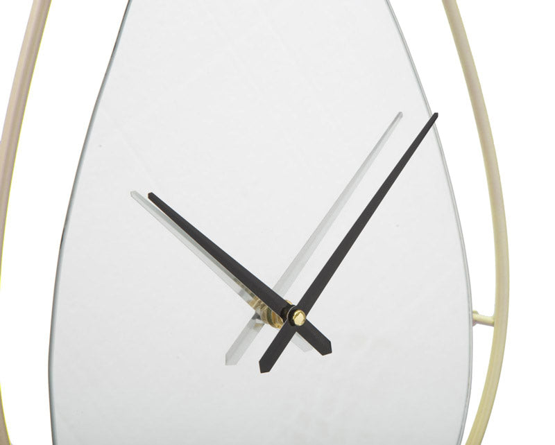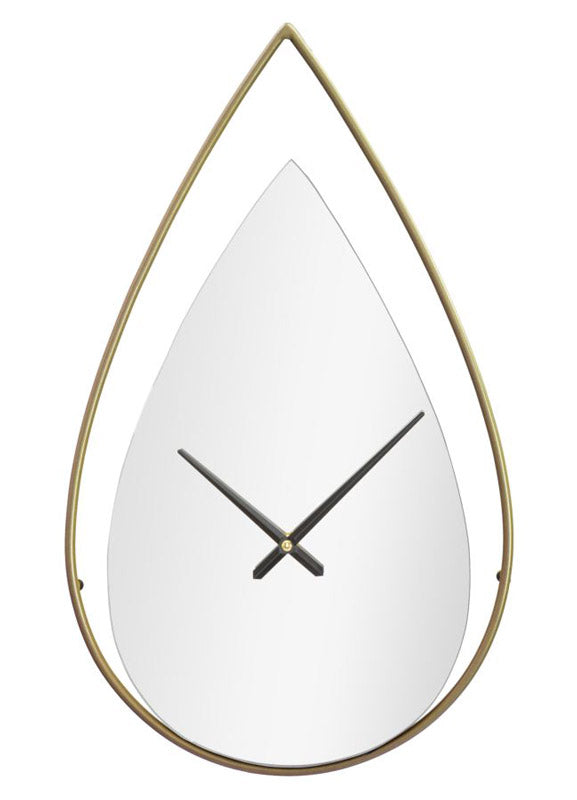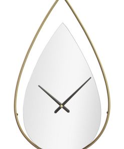 Orologio da parete definito da un design sintetizzato, caratterizzato dalla forma a goccia e da elementi raffinati. Infatti, l’orologio moderno si compone di semplice cornicetta in metallo dorato che incornicia uno specchio, il tutto accompagnato da semplici lancette colore nero.