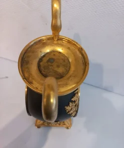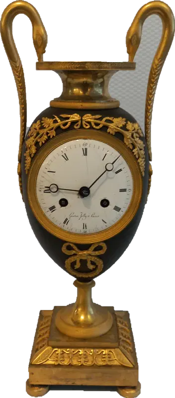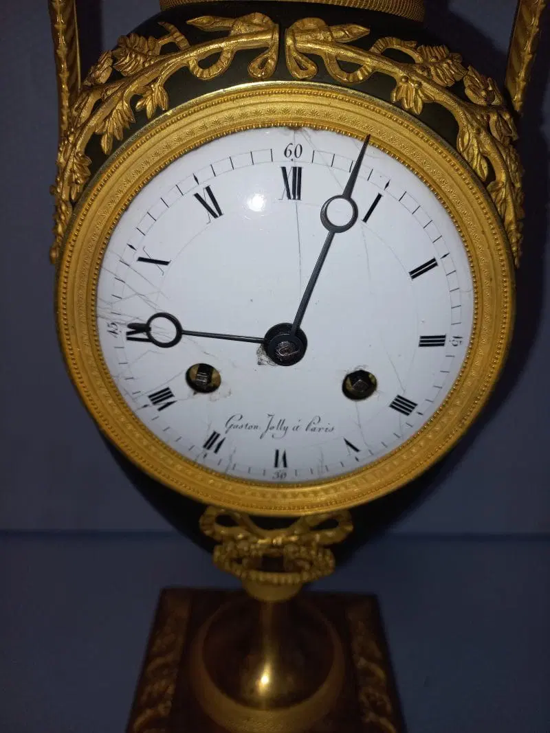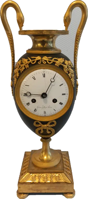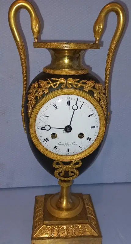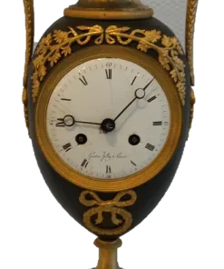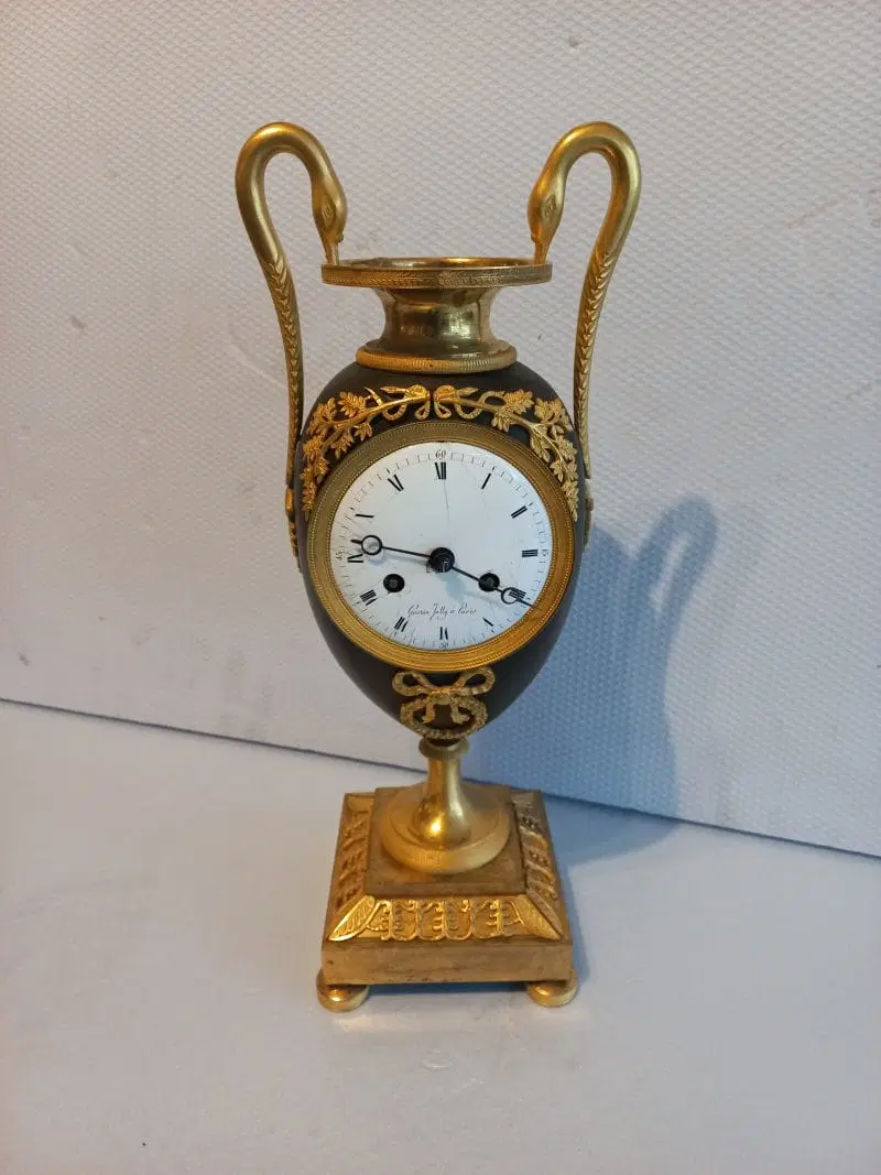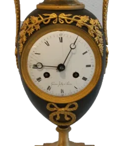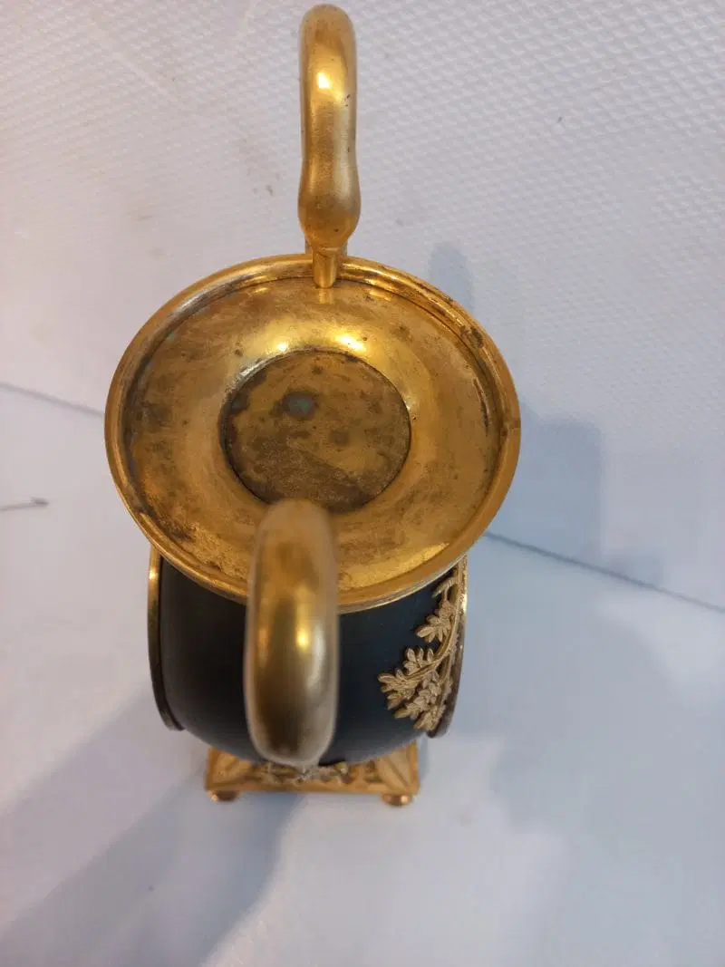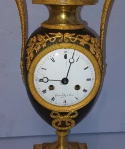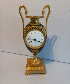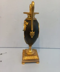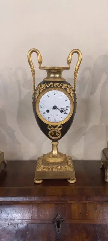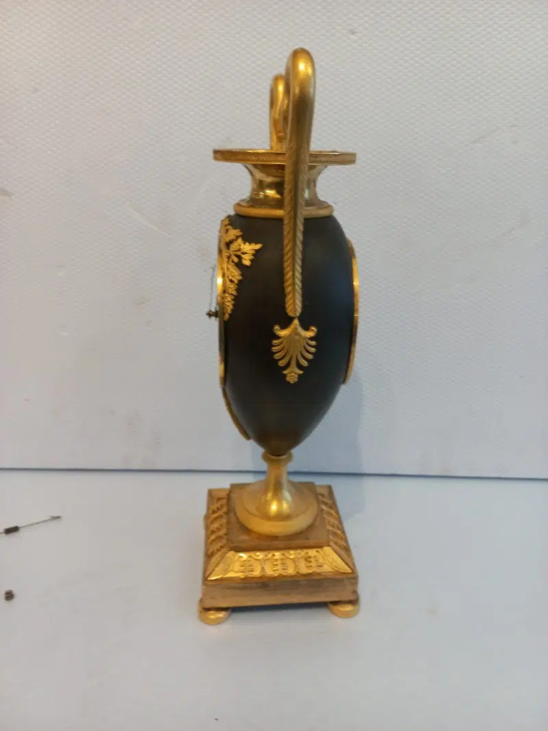Orologio del periodo impero a formadi vaso eseguito in bronzo e rifinito con parti dorate e brunito. Completo di pendolo e chiave ,si propone nello stato in cui si trova.