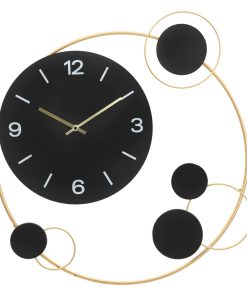Accattivante orologio da parete, per tutti coloro che apprezzano il design moderno e minimale. Infatti, questo orologio moderno si contraddistingue per una composizione di cerchi in metallo dorato ed elementi tondi in legno colore nero, seguendo un gioco dinamico ed armonico.