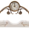 Orologio a pendolo da appoggio, con base in legno bianca, e due incisioni decorative, che si uniscono verso l’alto, per poi sorreggere il quadrante in ottone a pendolo, di forma tonda, con vetro e numeri romani. Perfetta per una stanza in stile vintage.