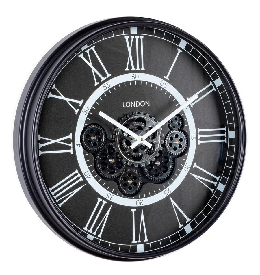 Orologio da parete tondo, realizzato interamente in acciaio, colore nero. Sul quadrante sono visibili gli ingranaggi, e i numeri sono in carattere romani, caratteristiche particolari per un complemento d’arredo moderno e originale.