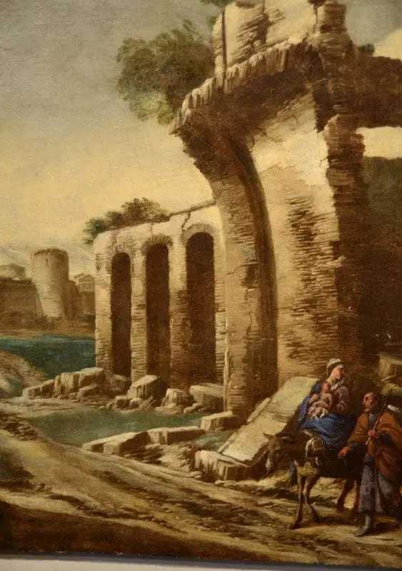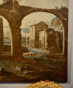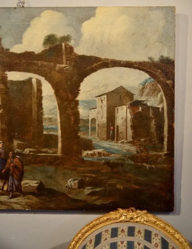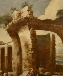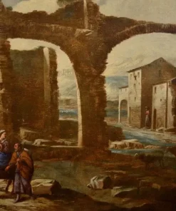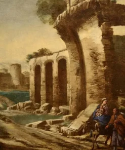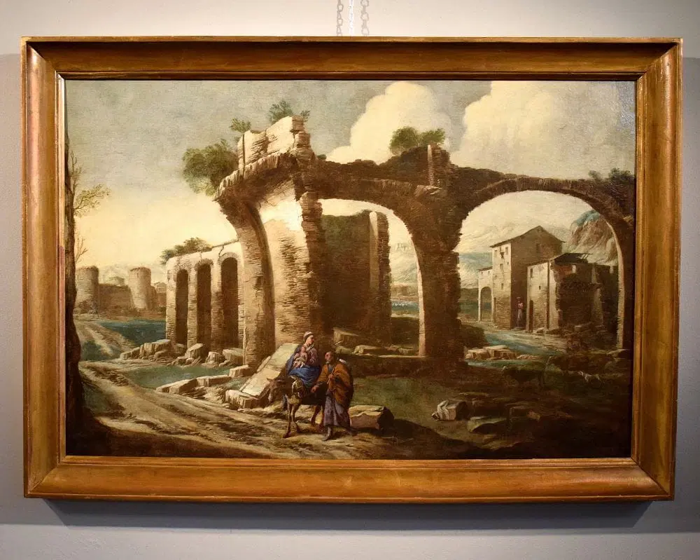 Il bel dipinto pubblicato, un ampio paesaggio con rovine architettoniche, rispecchia in toto la poetica pittorica di Antonio Travi (Sestri Ponente 1608 – Genova 1665), il primo paesaggista della scuola pittorica genovese; poetica che rimane costante in tutto l’arco della sua proficua carriera: dagli esordi, come allievo di Bernardo Strozzi, fino alla morte nel 1668, quando ormai la sua fiorente bottega era affiancato da numerosi figli e allievi. Le imponenti rovine, risaltate da una luminosità algida e lucente, fanno da sfondo all’episodio biblico della fuga in Egitto, con la Sacra Famiglia in primo piano.
