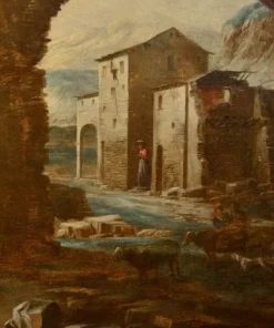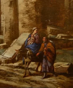 Per quanto concerne la composizione, resta pressoché immutata nel tempo la sua appassionata indagine sul paesaggio italianeggiante, dove la tracce del tempo che trascorre inesorabile – le architetture antiche in rovina e le casette diroccate – abitano gli scenari di una natura silenziosa. Le sue opere sono sempre animate da piccole figure, che svolgono con semplicità le loro attività quotidiane: portano le greggi ad abbeverarsi o a pascolare sulle rive del fiume. La stessa quotidianità popolare dei suoi soggetti di genere caratterizza anche i dipinti con tema sacro, come quello in esame, sempre dominati da un ordine che infonde una sovrana quiete all’ambiente.