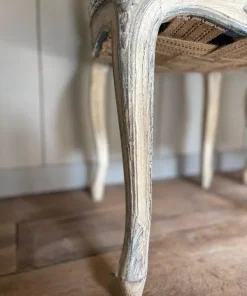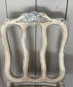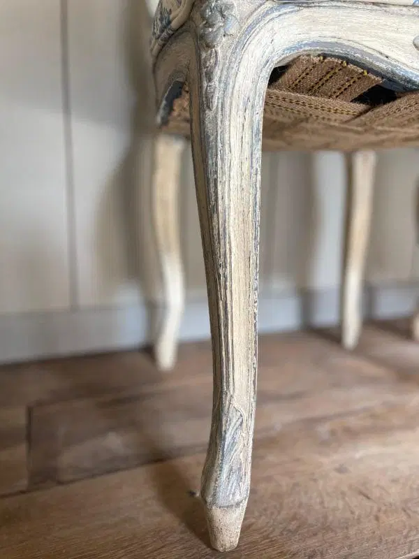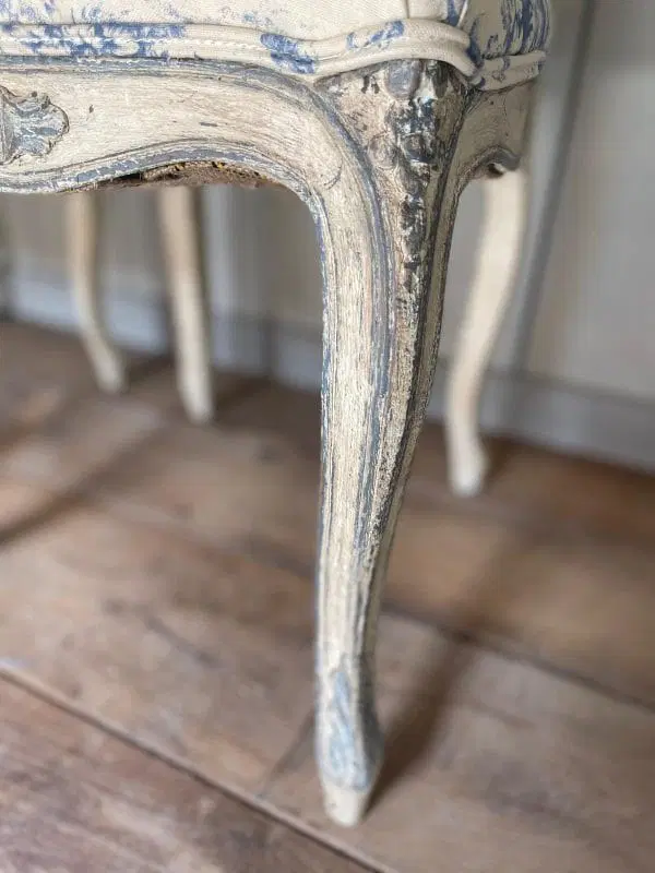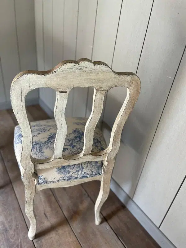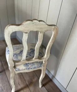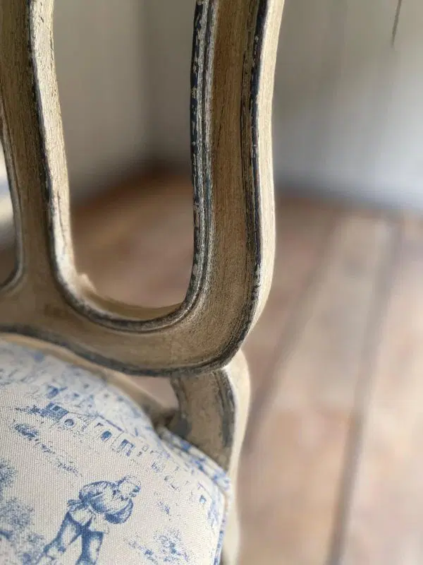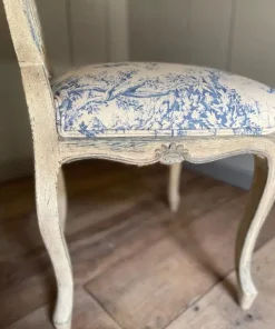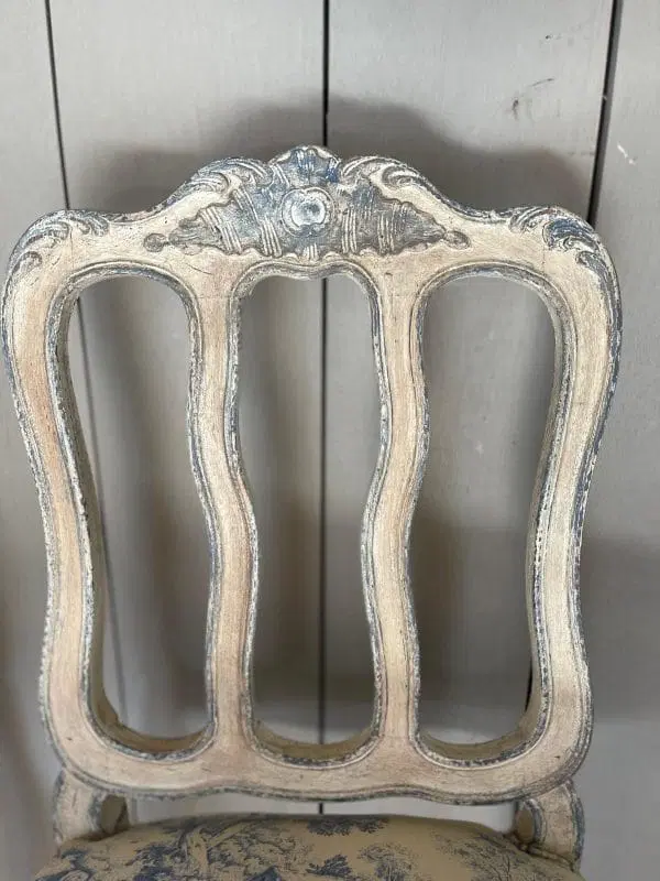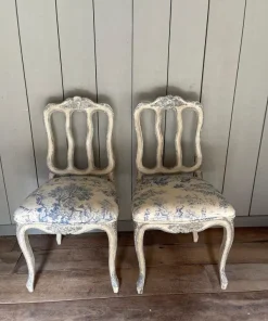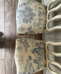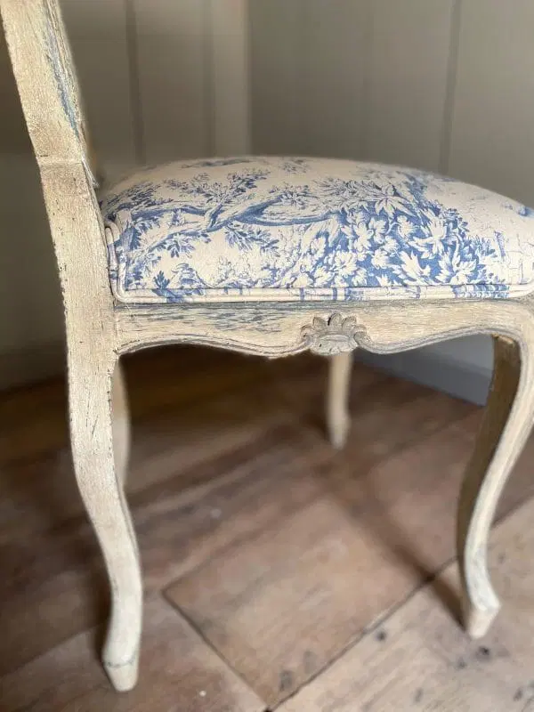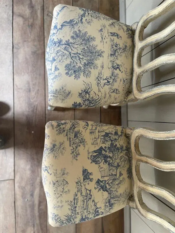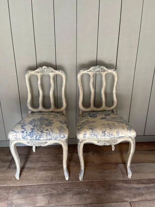 Magnifique paire de chaises patinée, nouveau garnissage tissus toile de jouy et finition passe poil
