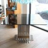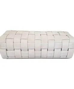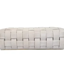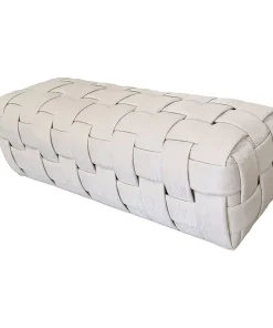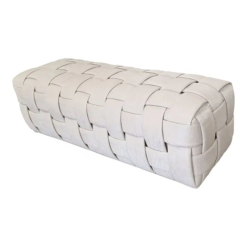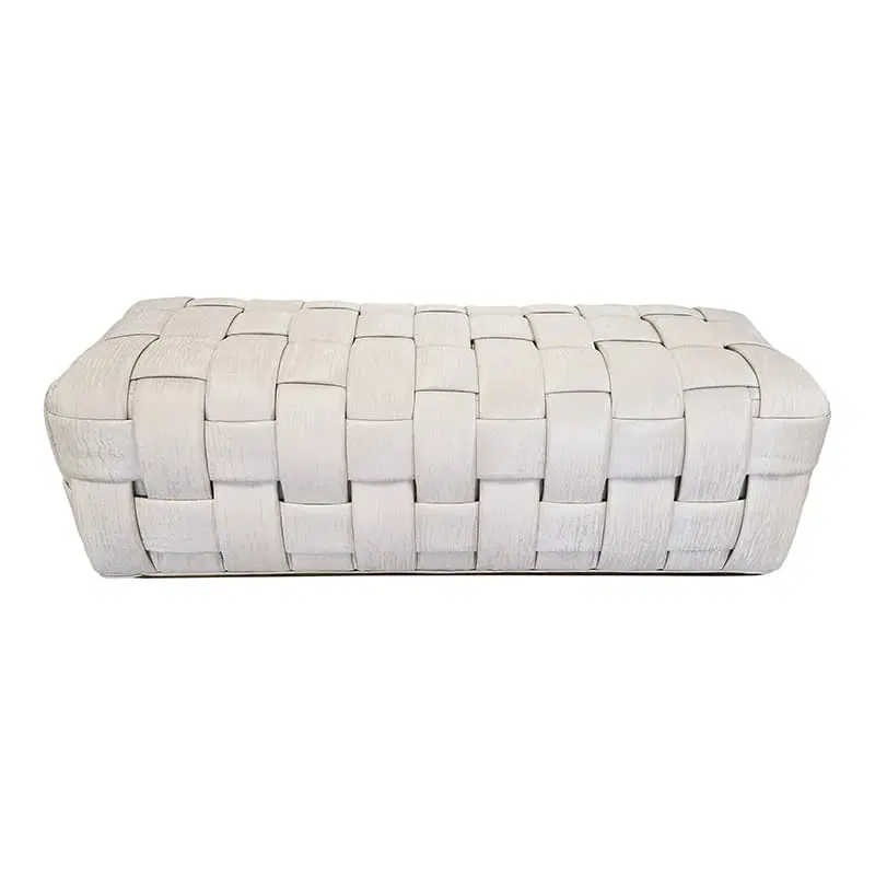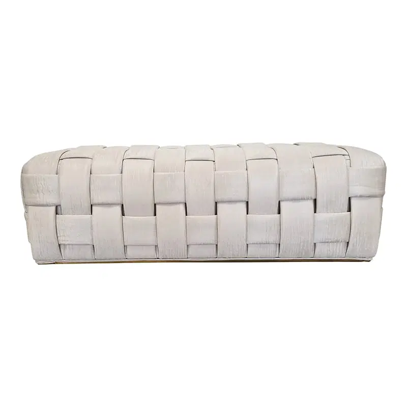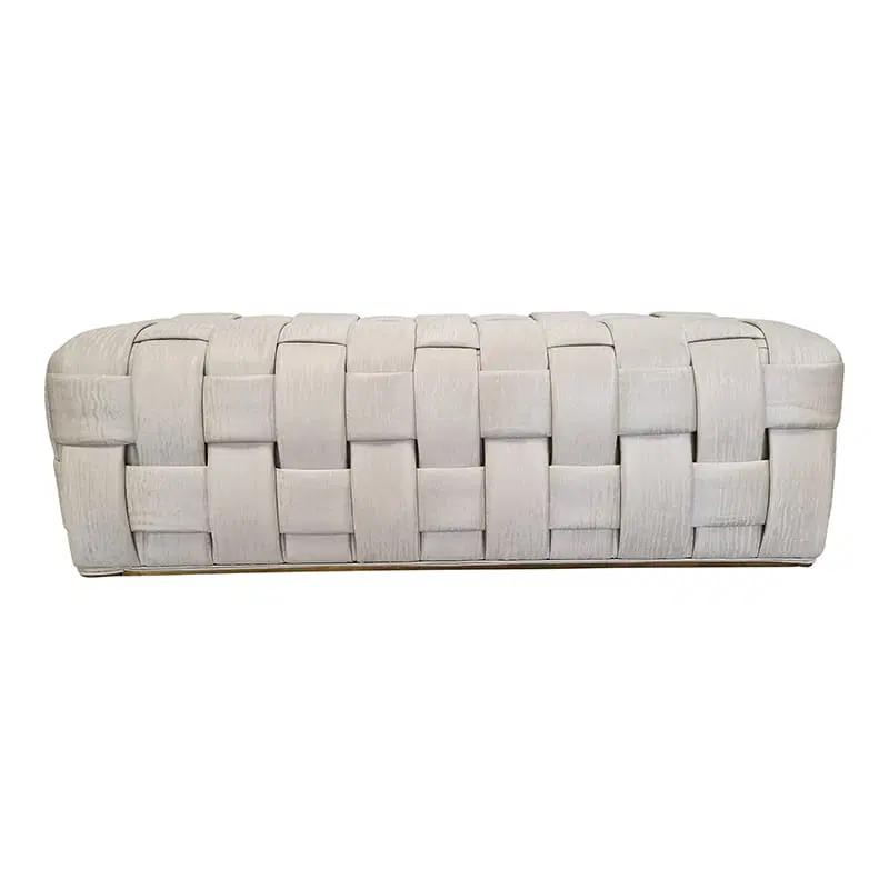 Panchetta pouf rettangolare in tessuto tecnico intrecciato color sabbia. Base in ottone.