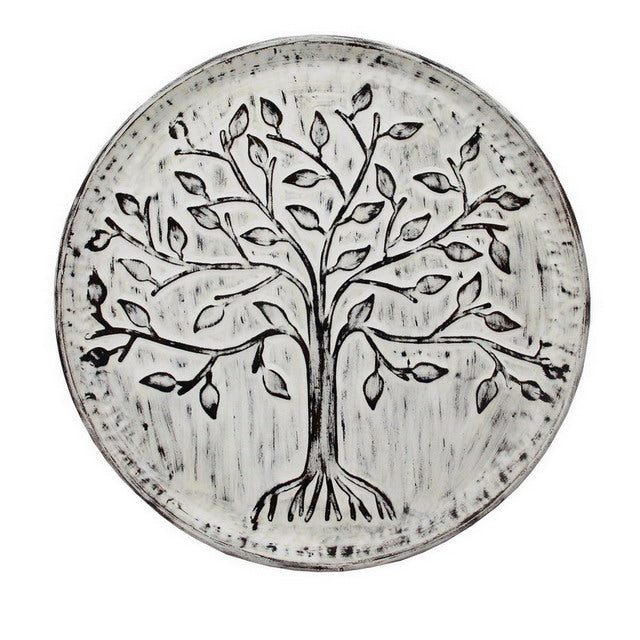 Pannello da parete tondo ritraente un albero realizzato in metallo in rilievo, caratterizzato da effetto decapato.