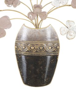 Decorazione per parete realizzata in metallo riproducente un vaso completo di tanti fiorellini. Da notare i particolari che decorano il vaso e i colori delicati che colorano fiori, oltre che una lavorazione minuziosa e in tridimensionale.