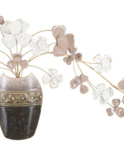 Decorazione per parete realizzata in metallo riproducente un vaso completo di tanti fiorellini. Da notare i particolari che decorano il vaso e i colori delicati che colorano fiori, oltre che una lavorazione minuziosa e in tridimensionale.