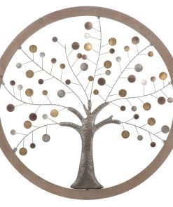 Pannello da parete decorativo raffigurante un albero stilizzato, realizzato in metallo con vari colori e con cornice in legno.