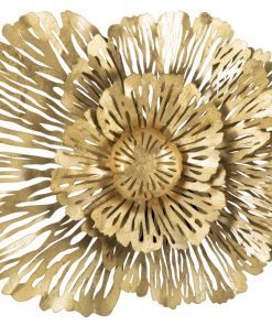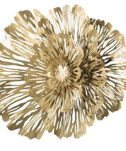 Pannello decorativo dal design moderno e stilizzato, raffigurante un fiore in metallo dorato con lavorazione a traforo, perfetto per ingresso, salotto e soggiorno.
